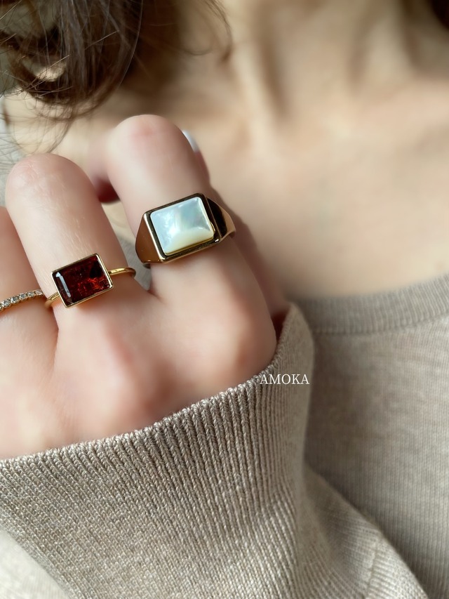 セット販売〈2個付けが目を惹く〉 ガーネット×ホワイトシェル レクタングルリングセット販売