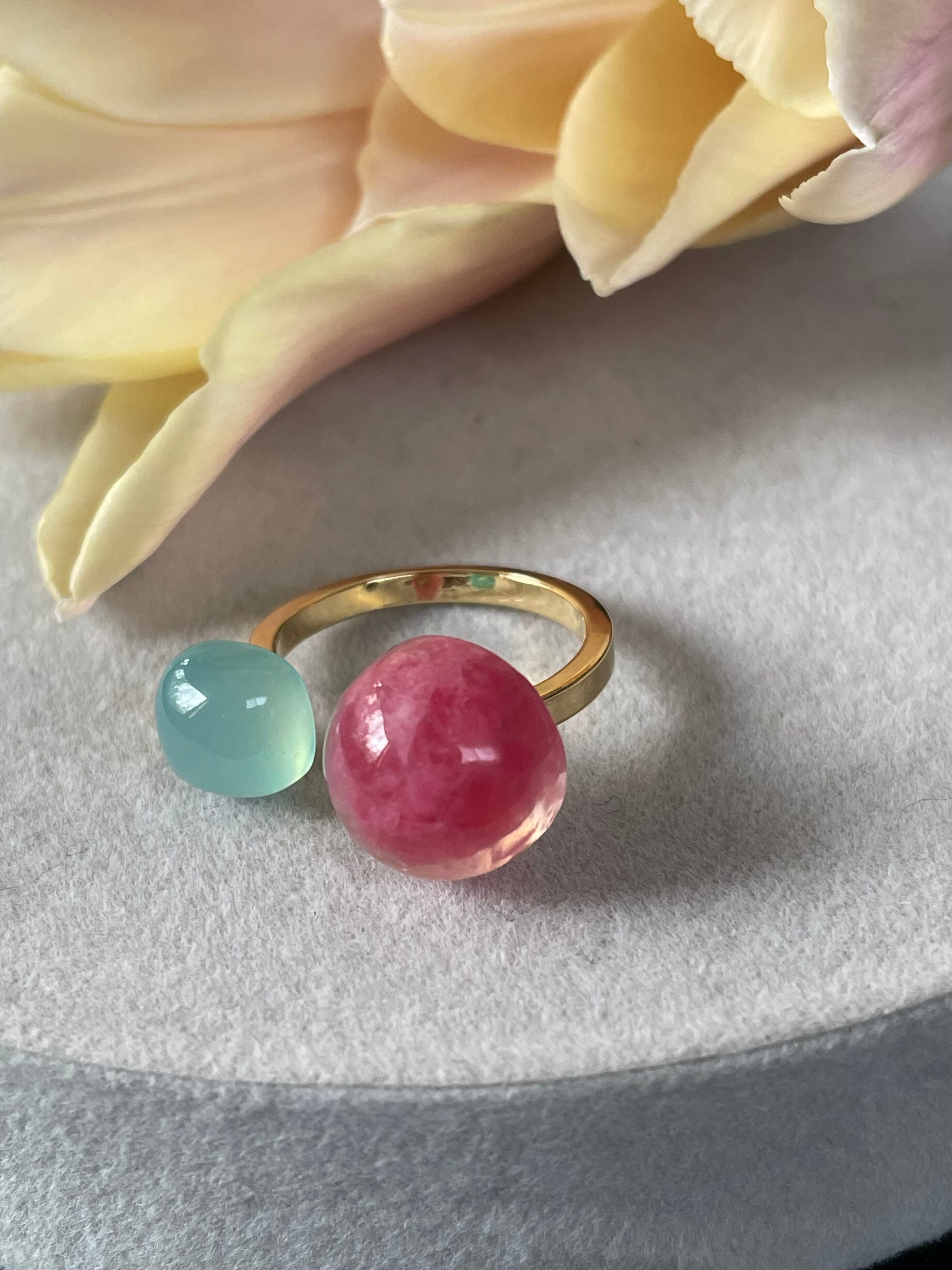 希少なロシア産インペリアルロードナイトシリカのラウンドカボションと、透き通るようなシーブルーカルセドニーのスクエアカボションをあしらった、印象的なフォークリングです。