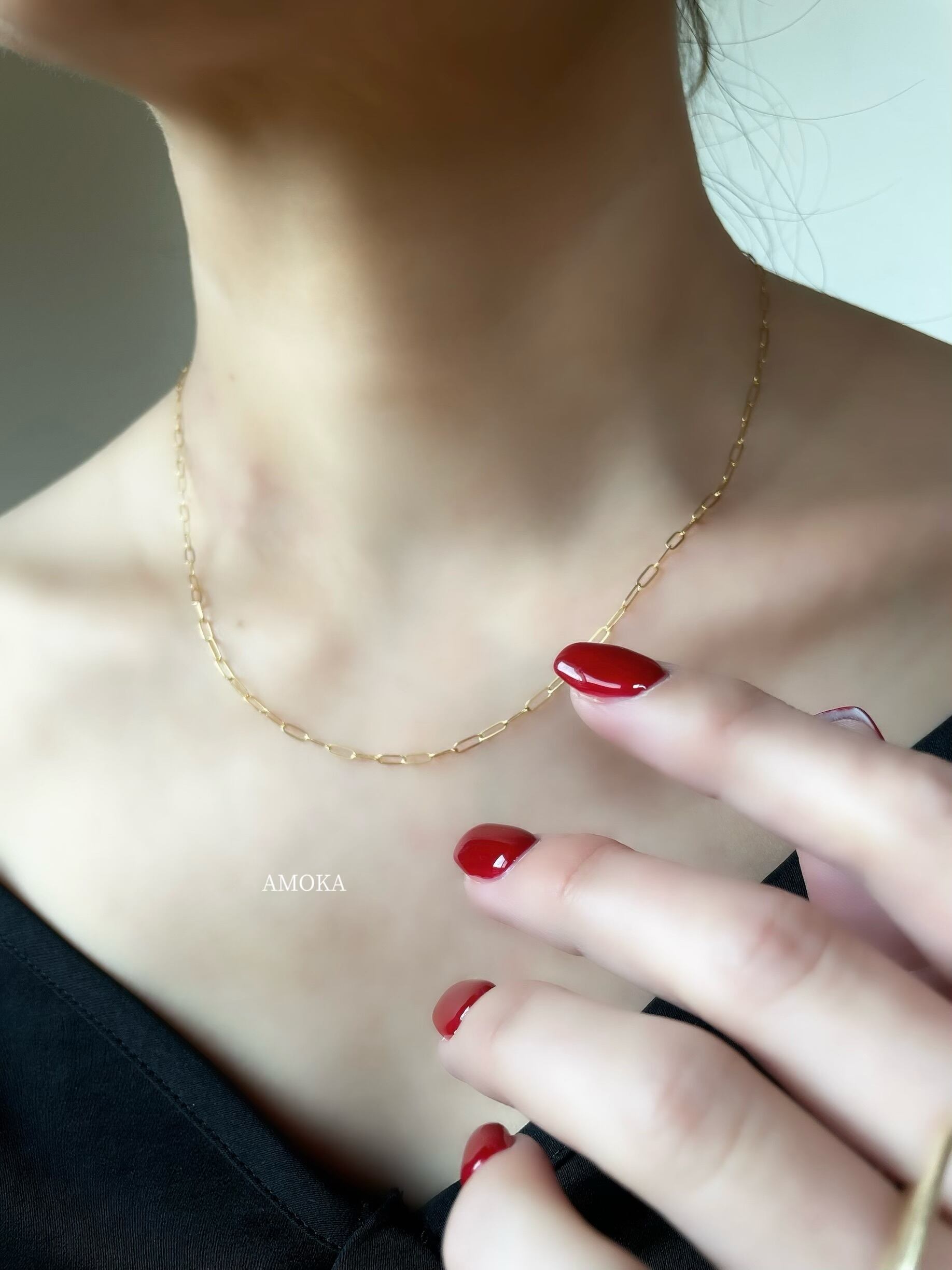 華奢なあずきチェーンが肌になじみ、単体でも、重ねづけでも洗練された印象を与えます。