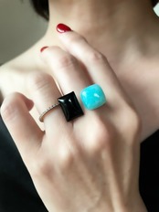 鮮やかなスカイブルーが印象的なペルー産アマゾナイトと、深い黒の艶が魅力的なブラックオニキスを組み合わせた、フォークリングです。