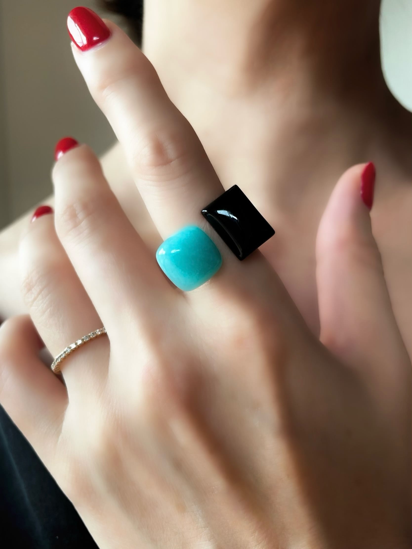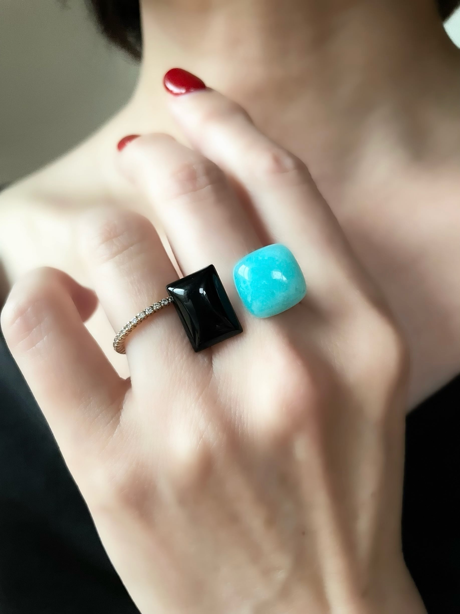 スクエア型とレクタングル型、それぞれ異なるフォルムの天然石が、指先で美しいバランスを描きます。