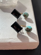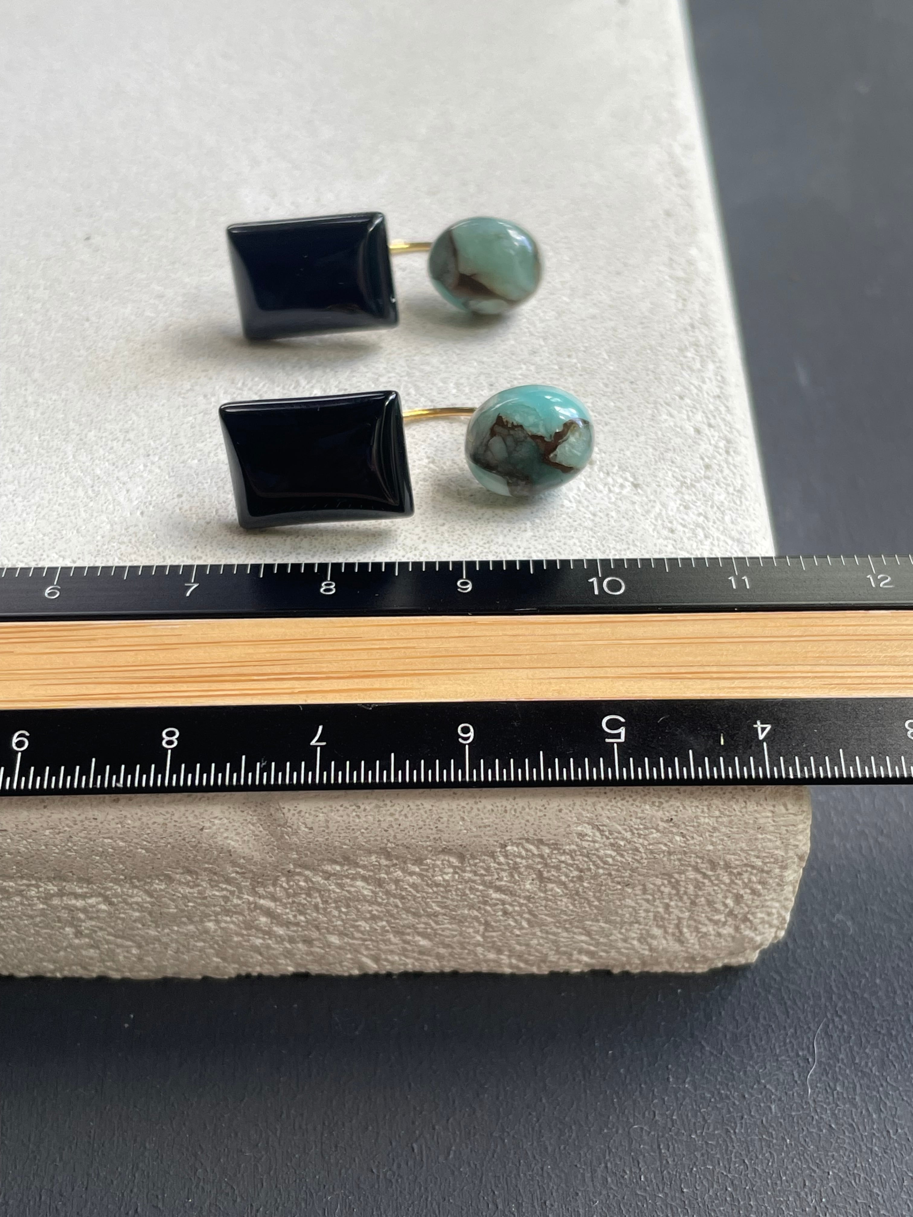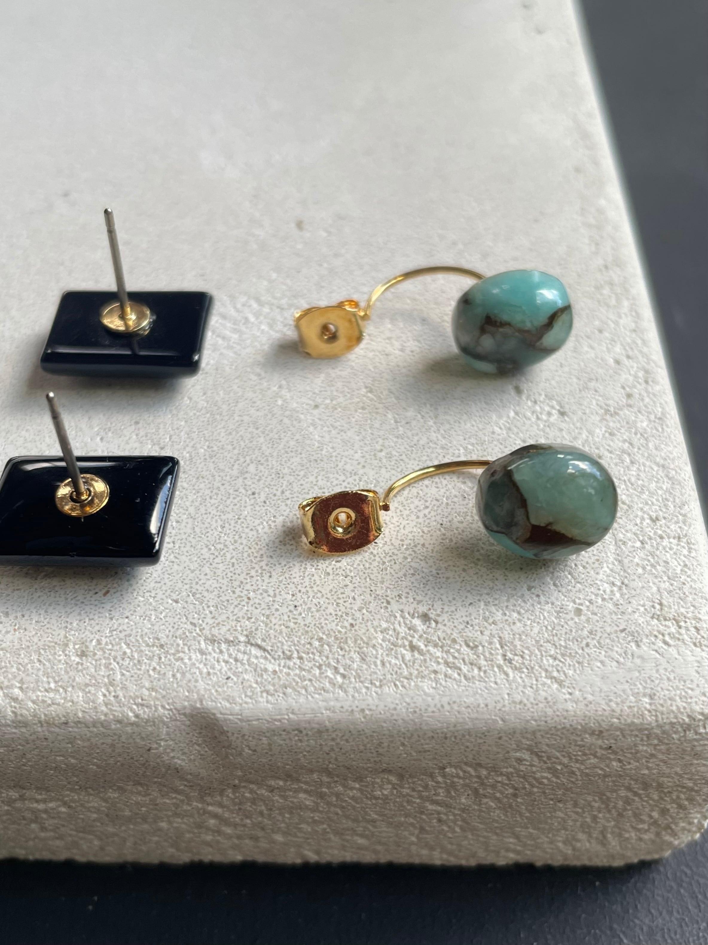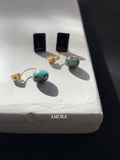 艶やかなブラックオニキスのレクタングルカボションに、輝きを散りばめたようなコッパーアマゾナイトのデザインキャッチを添えた2wayピアス。