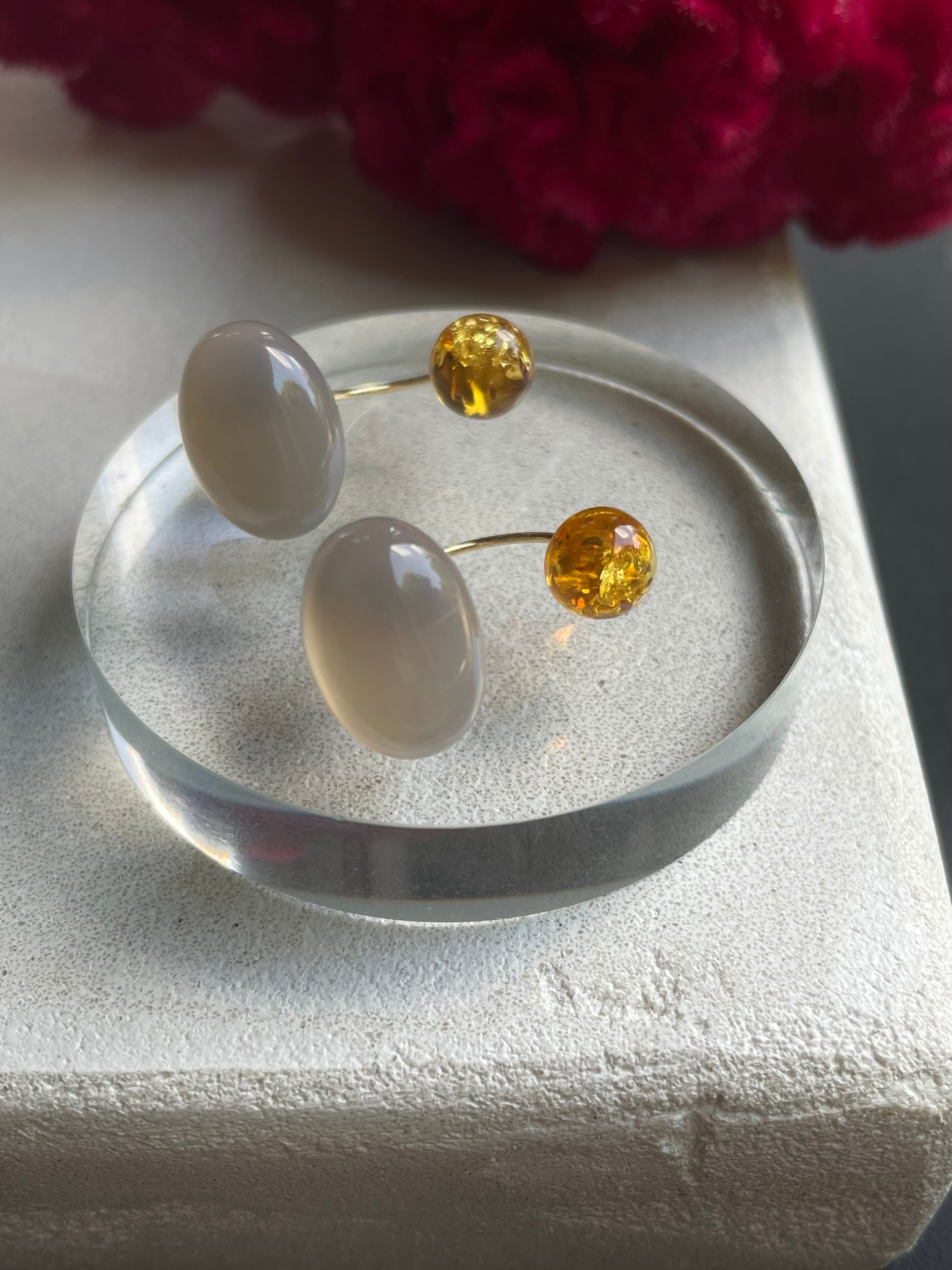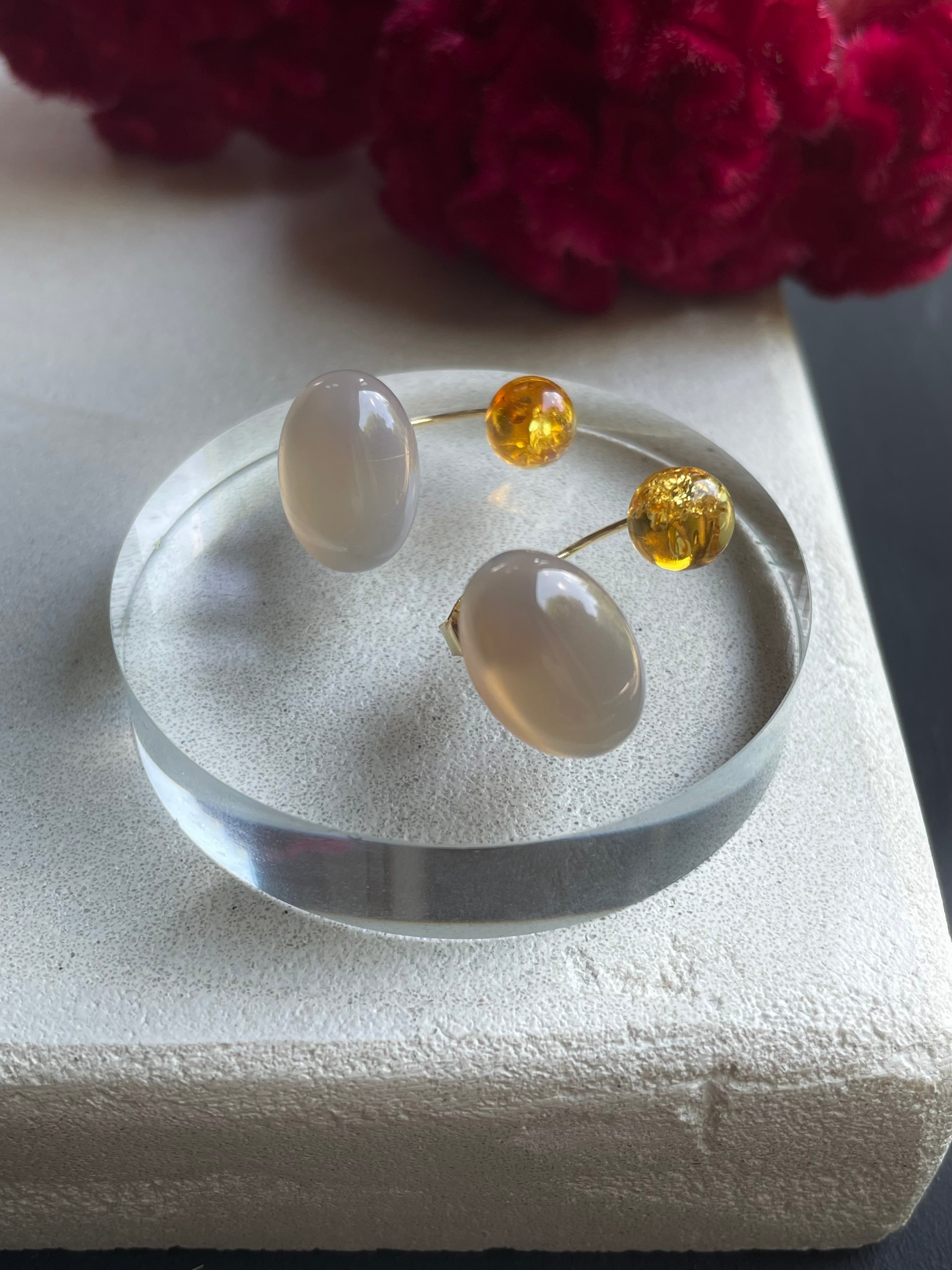 艶やかなグレーオニキスのピアスに、デザイン性の高いアンバーのキャッチを組み合わせた、唯一無二の2wayピアス。