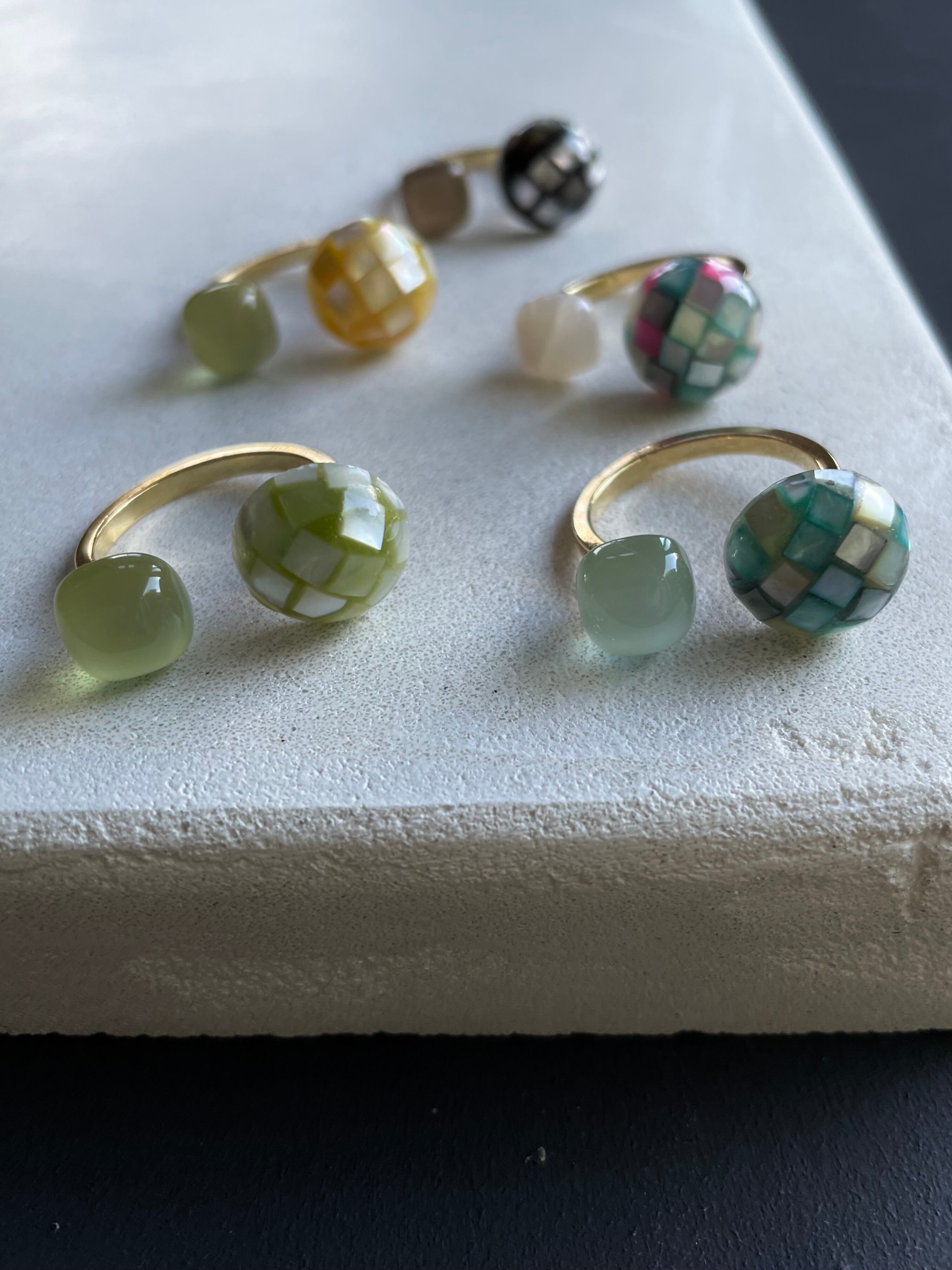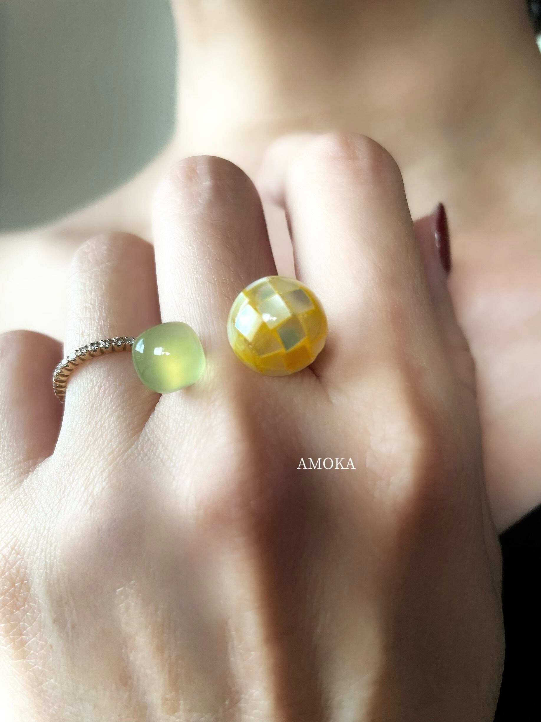 陽光を感じるイエローカラーのモザイクシェルと、爽やかなグリーンカルセドニーのフォークリング。