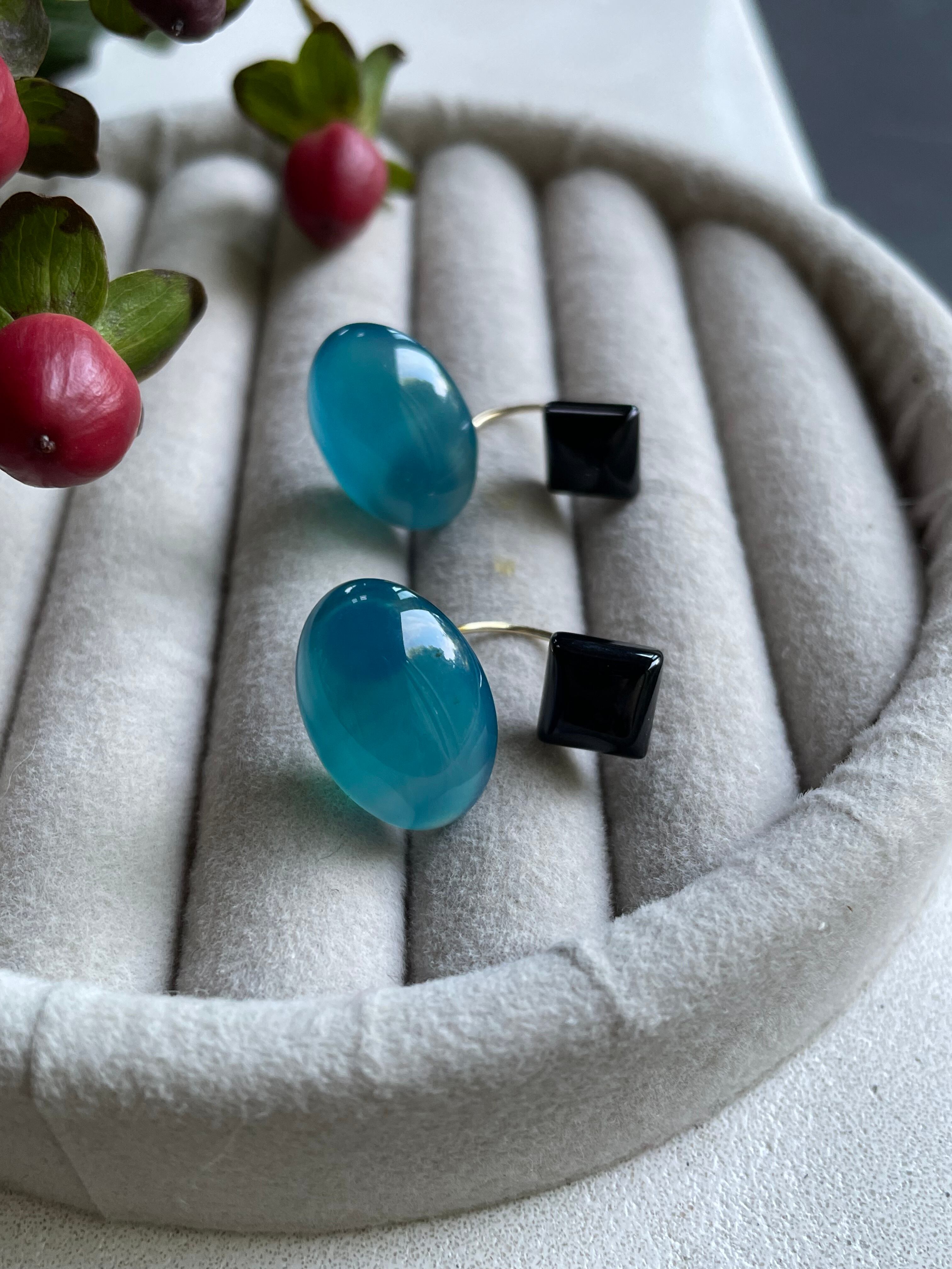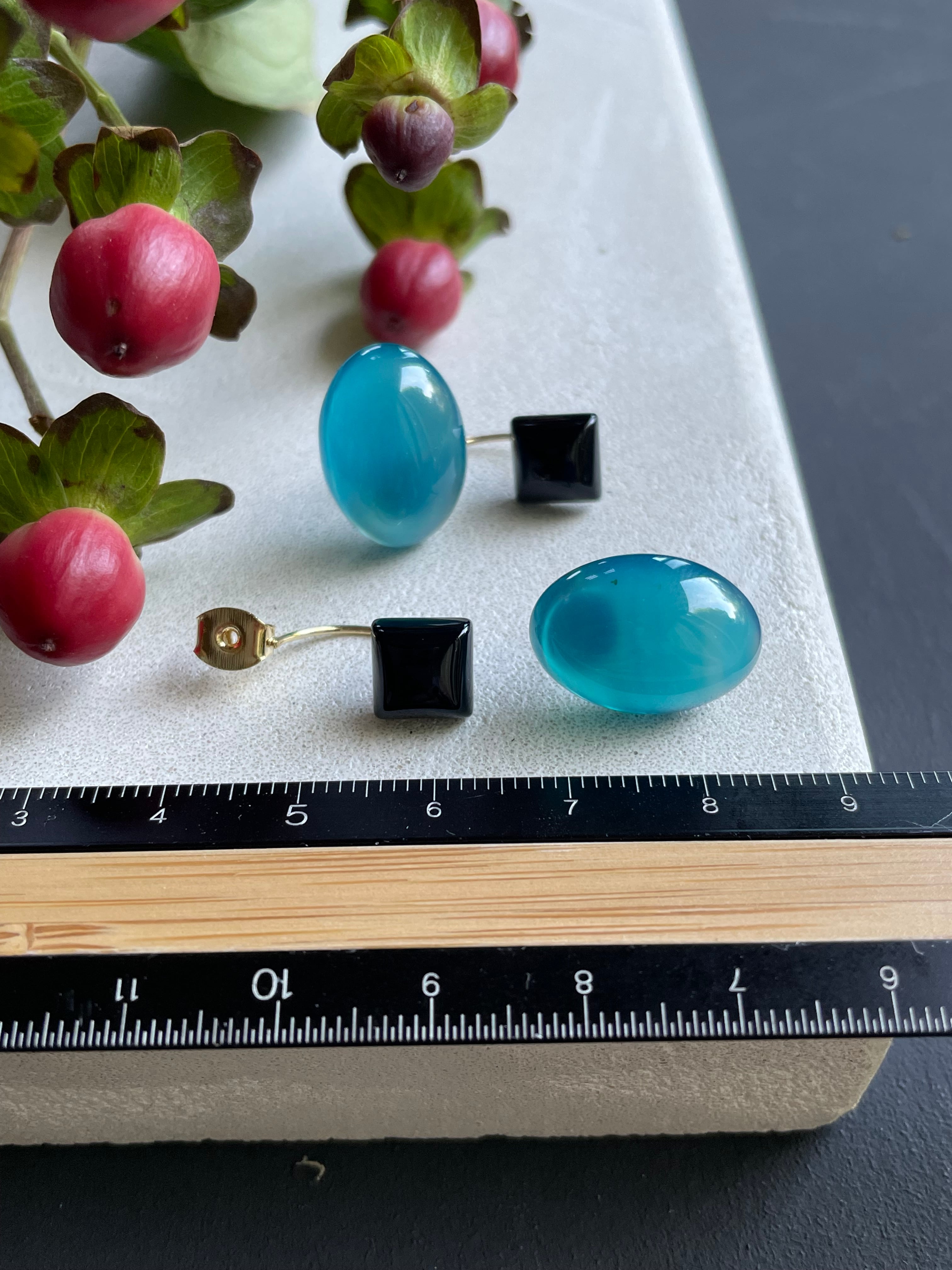 ブルーカルセドニー × スクエア型ブラックオニキス 2wayピアス