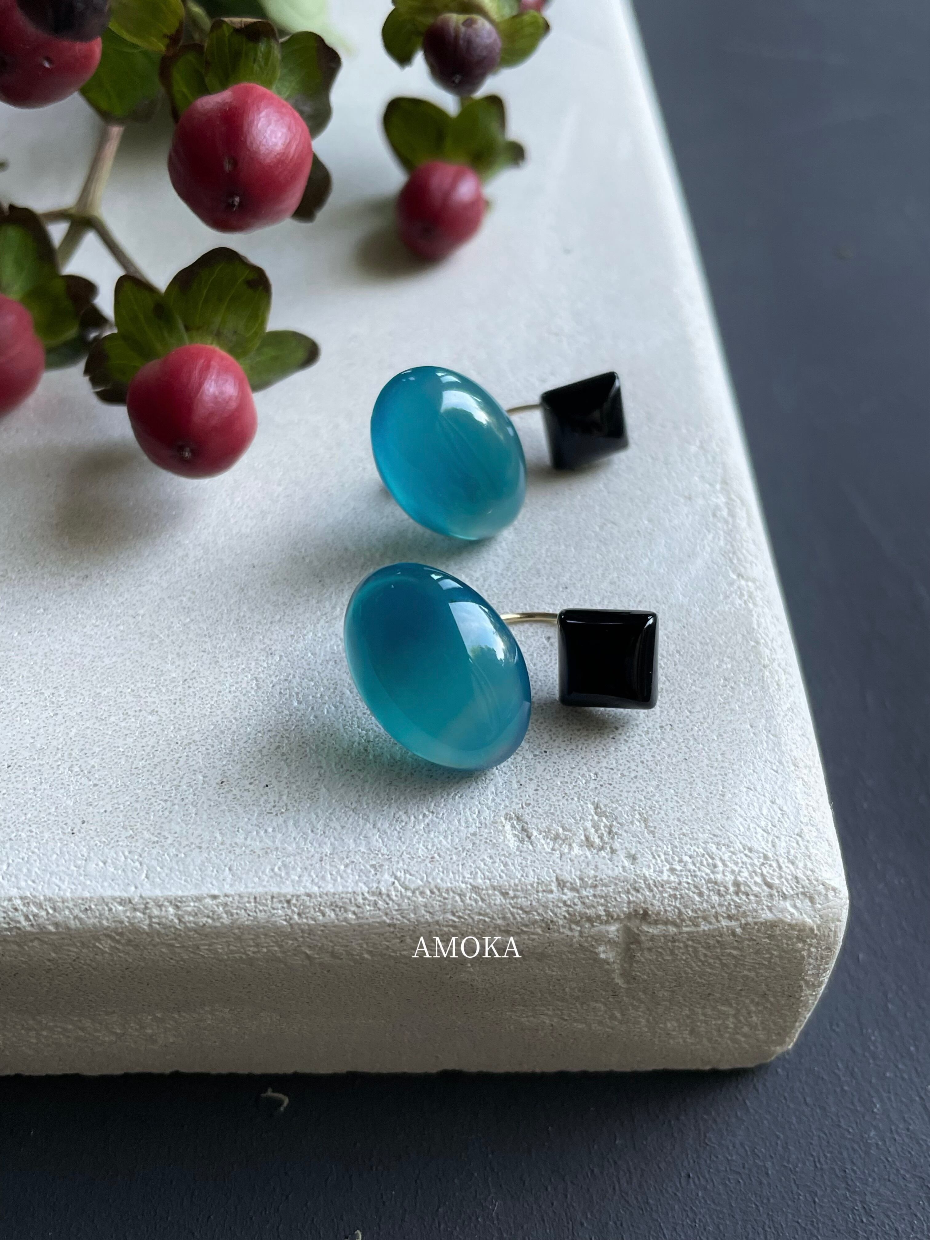やわらかな光をまとったブルーカルセドニーと、凛とした存在感を放つスクエア型ブラックオニキスが織りなす、上品でモダンな2wayピアス。
