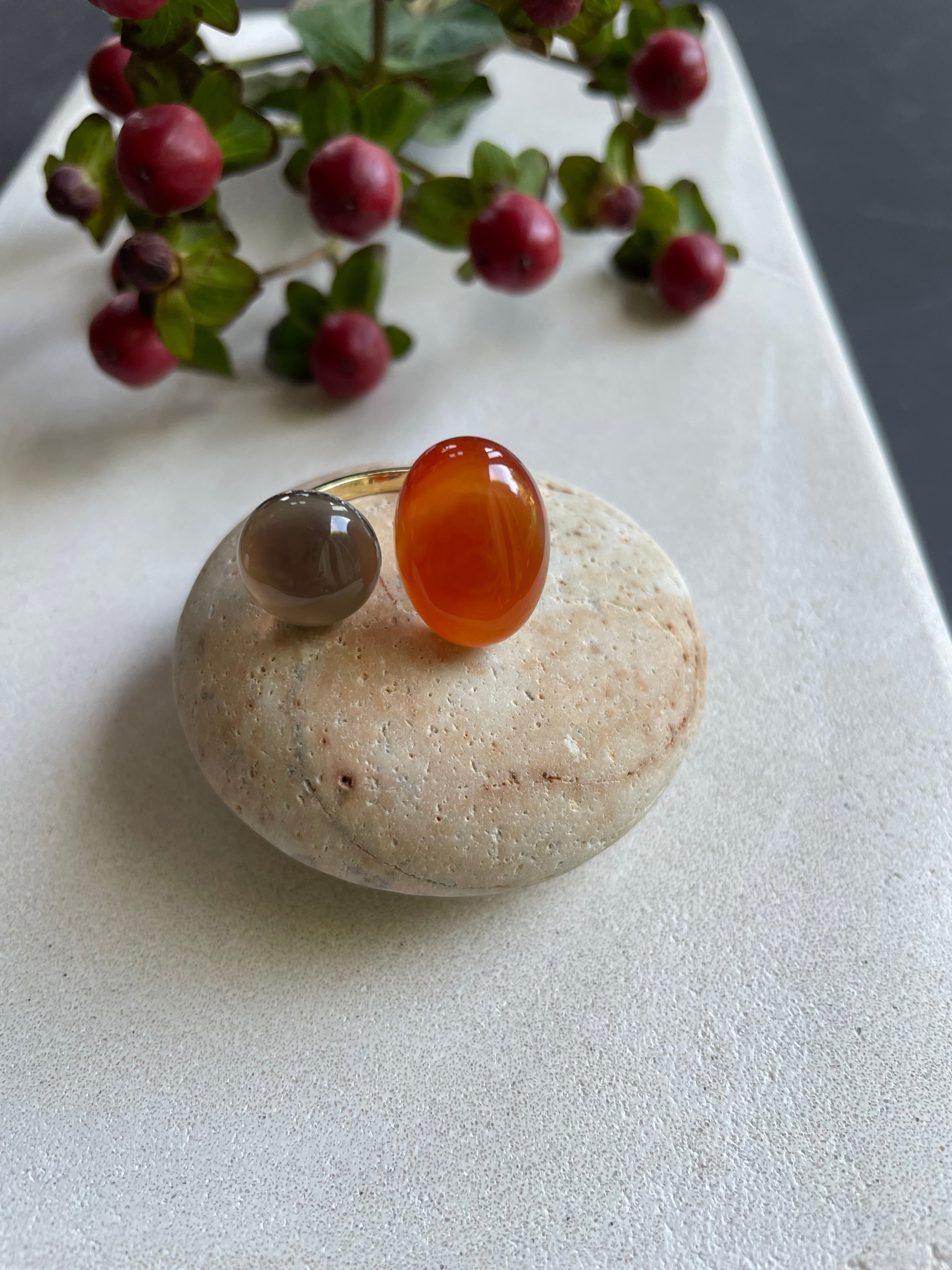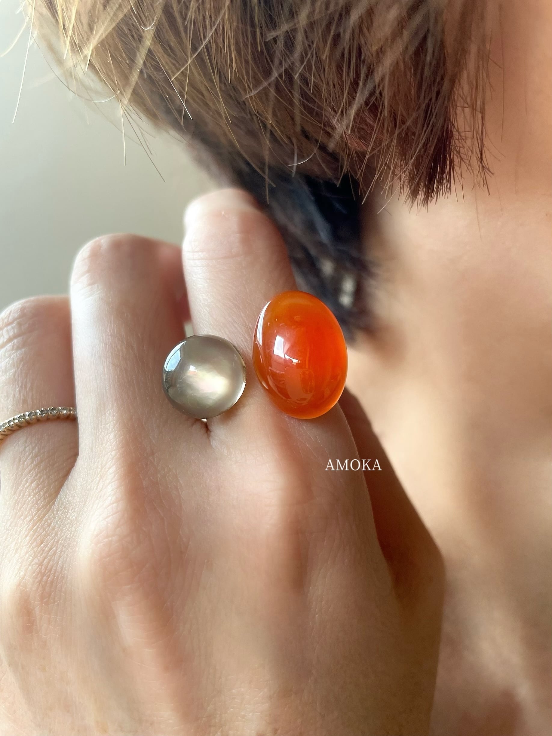 深みのあるオレンジが魅力のカーネリアン(オーバルカボション)と、やわらかく艶めくシェルカボションをあしらった、天然石のフォークリング。