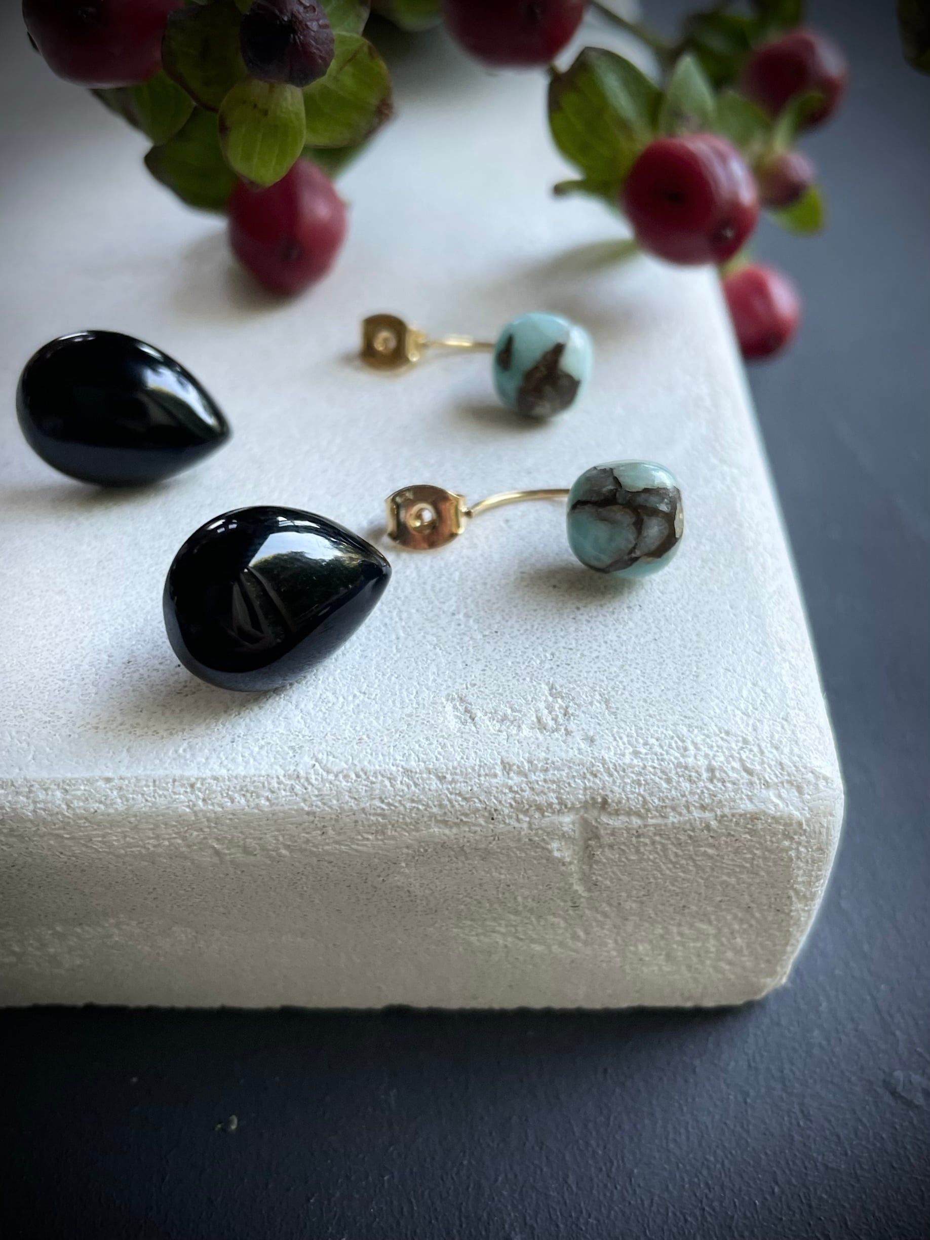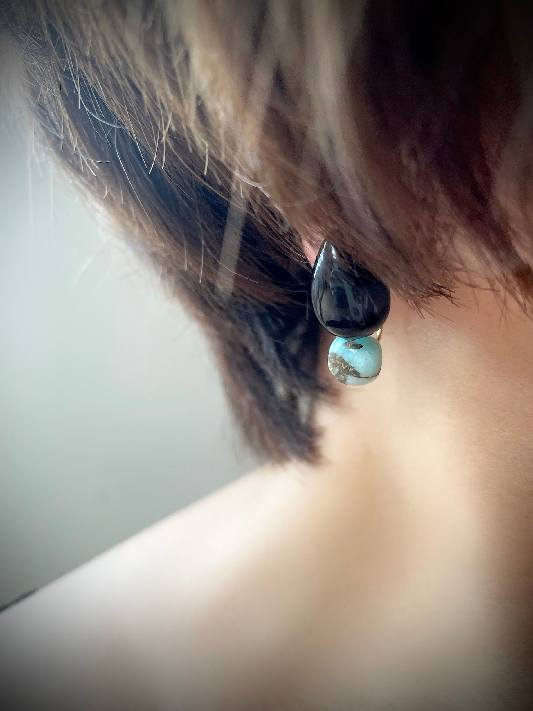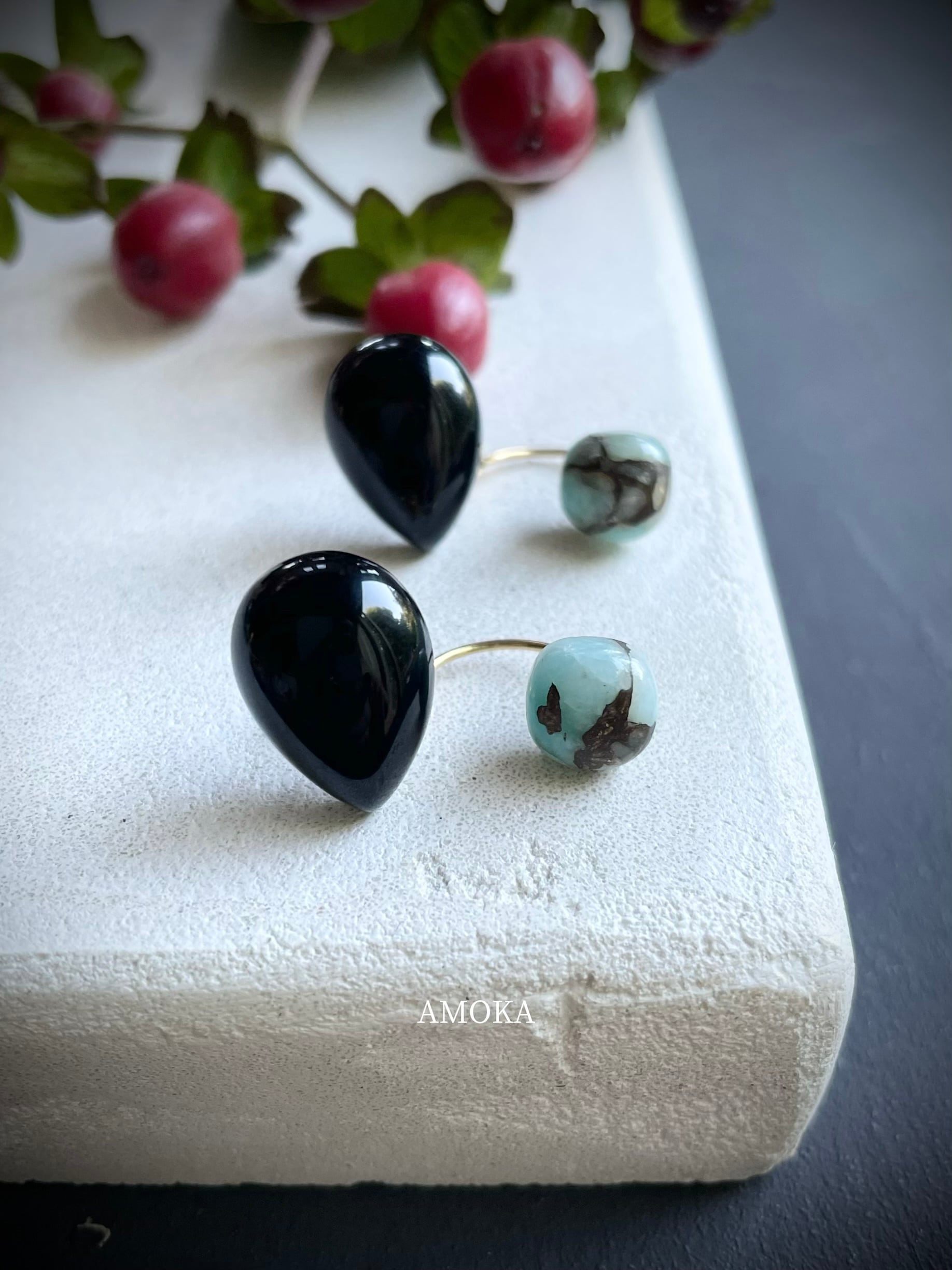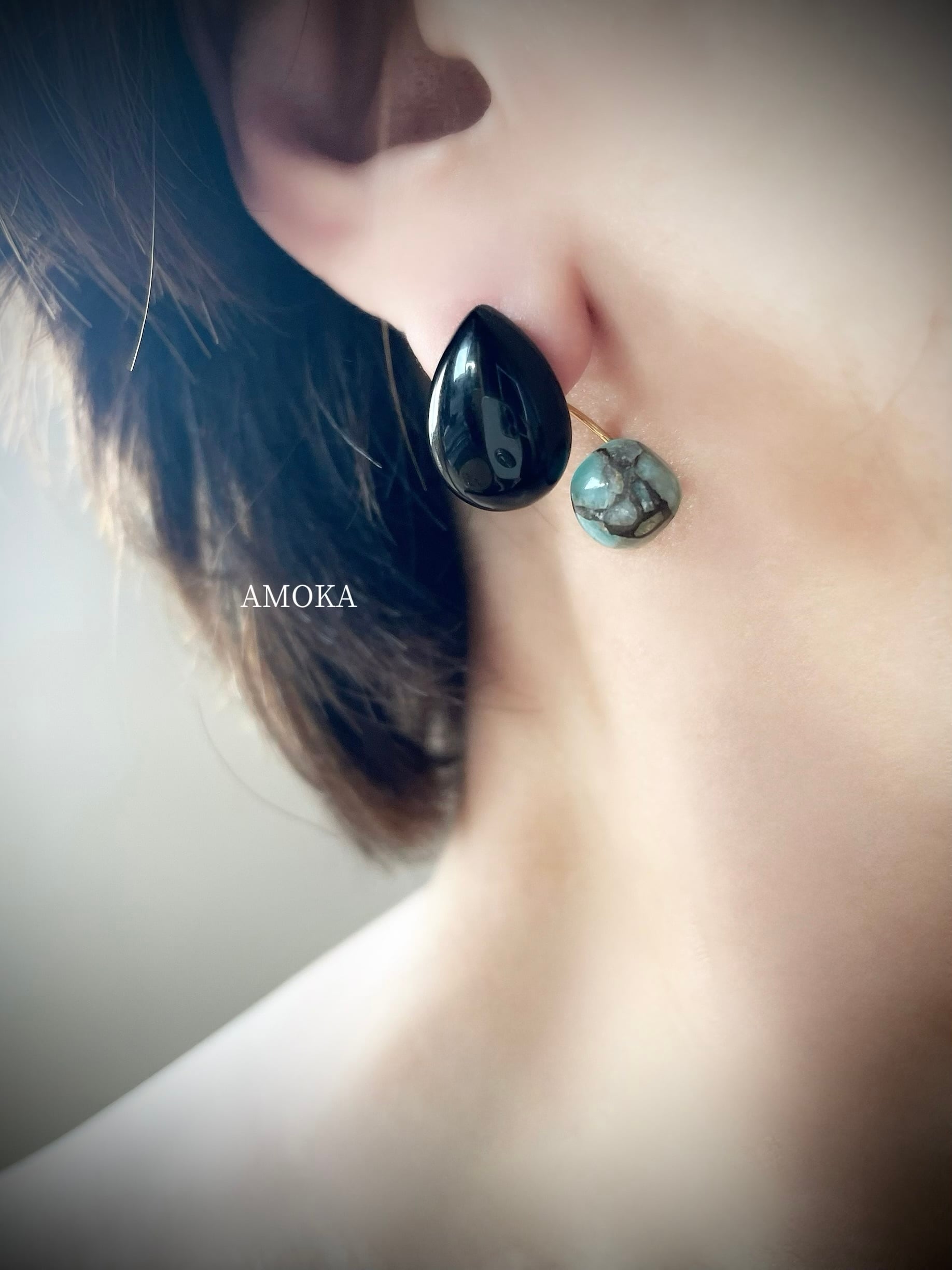 上品な存在感を放つ、ブラックオニキスのペアシェイプカボションと、個性的な輝きを添えるコッパーアマゾナイトのデザインキャッチが魅力の2wayピアスです。