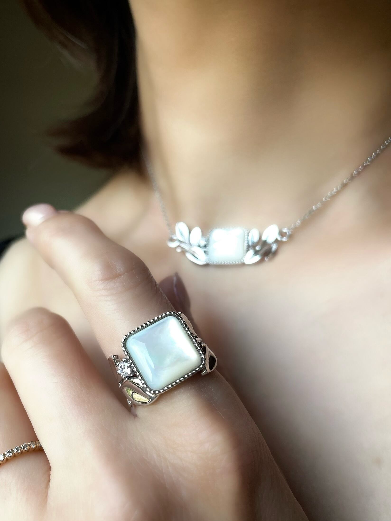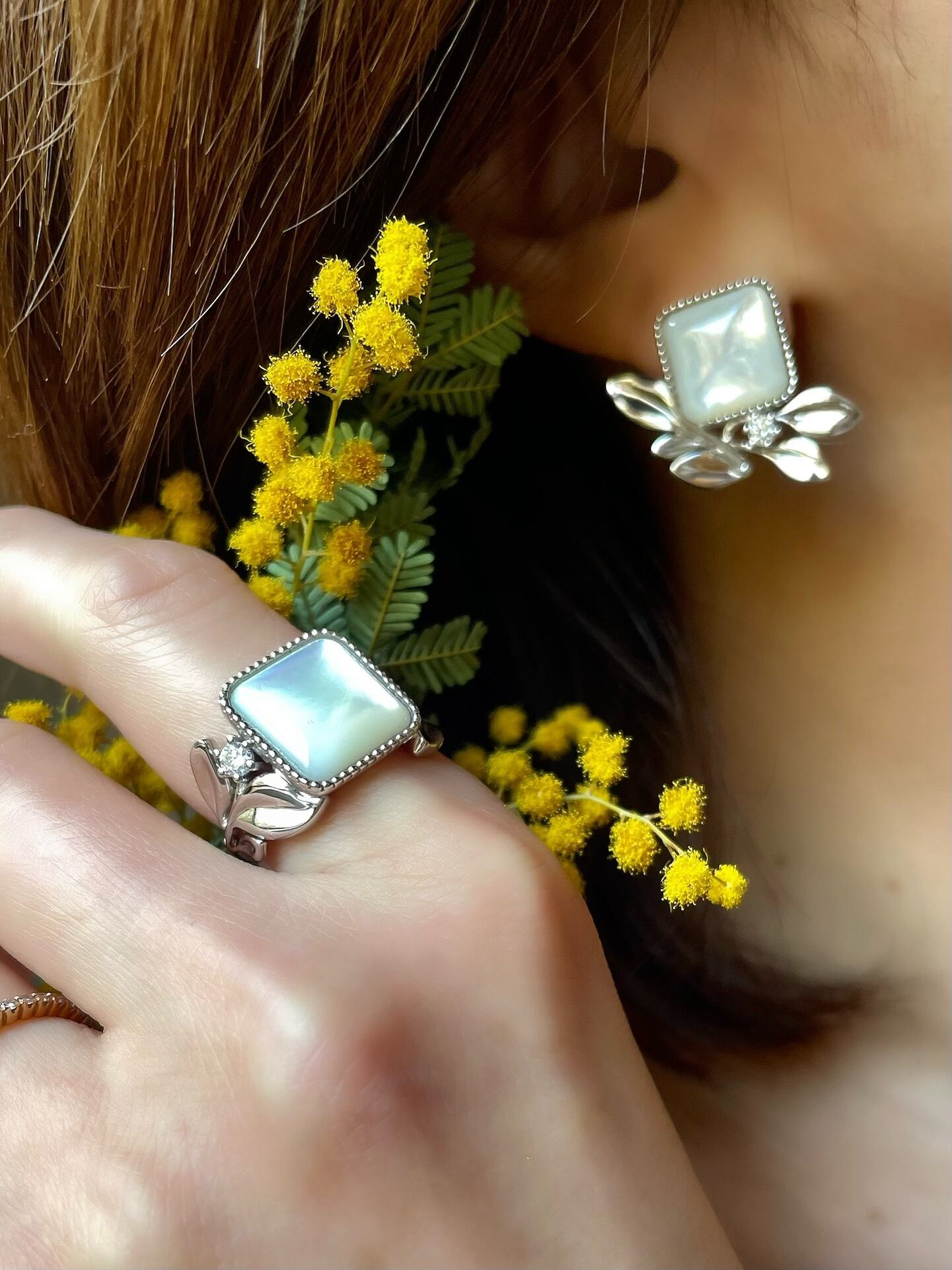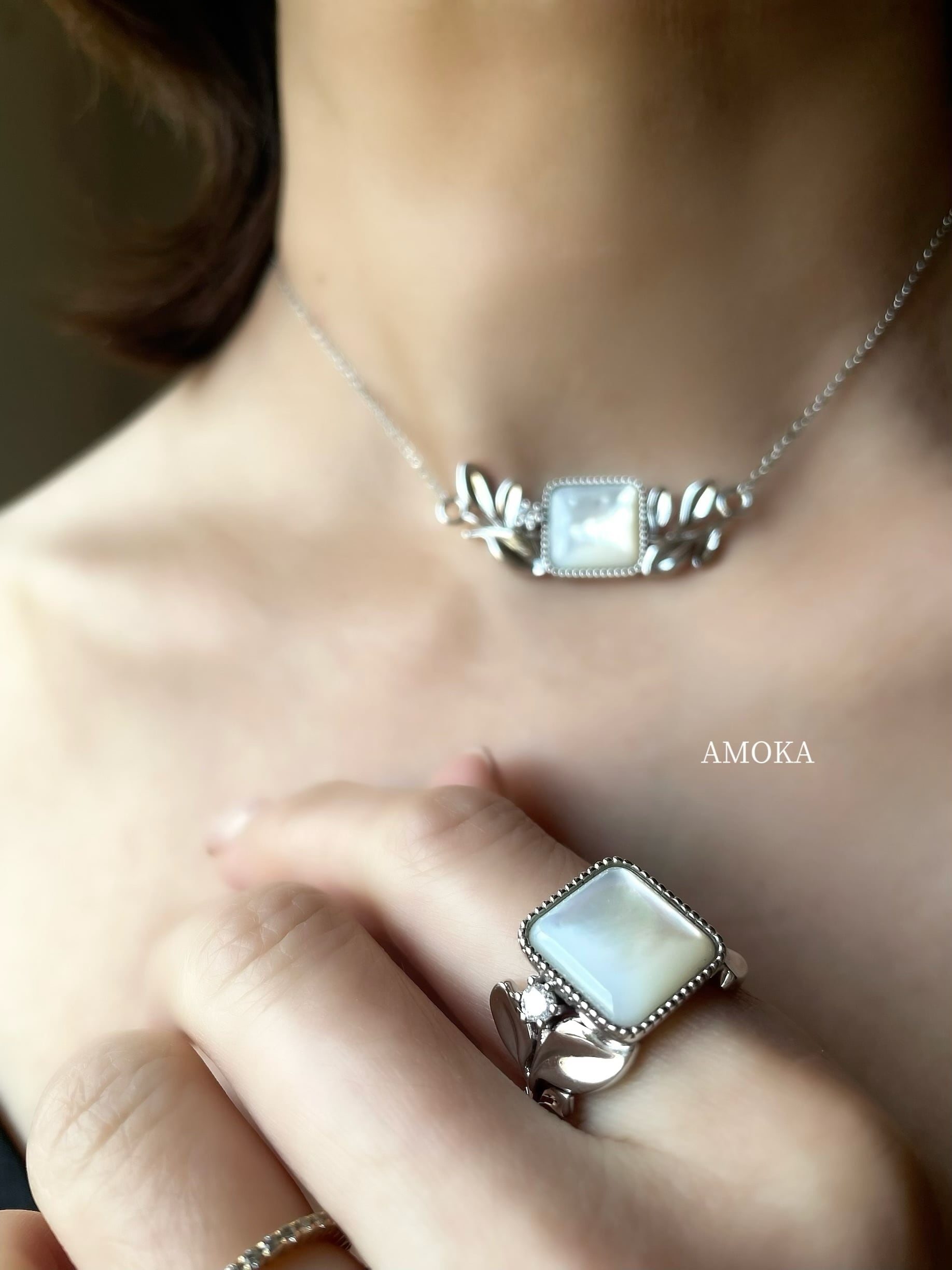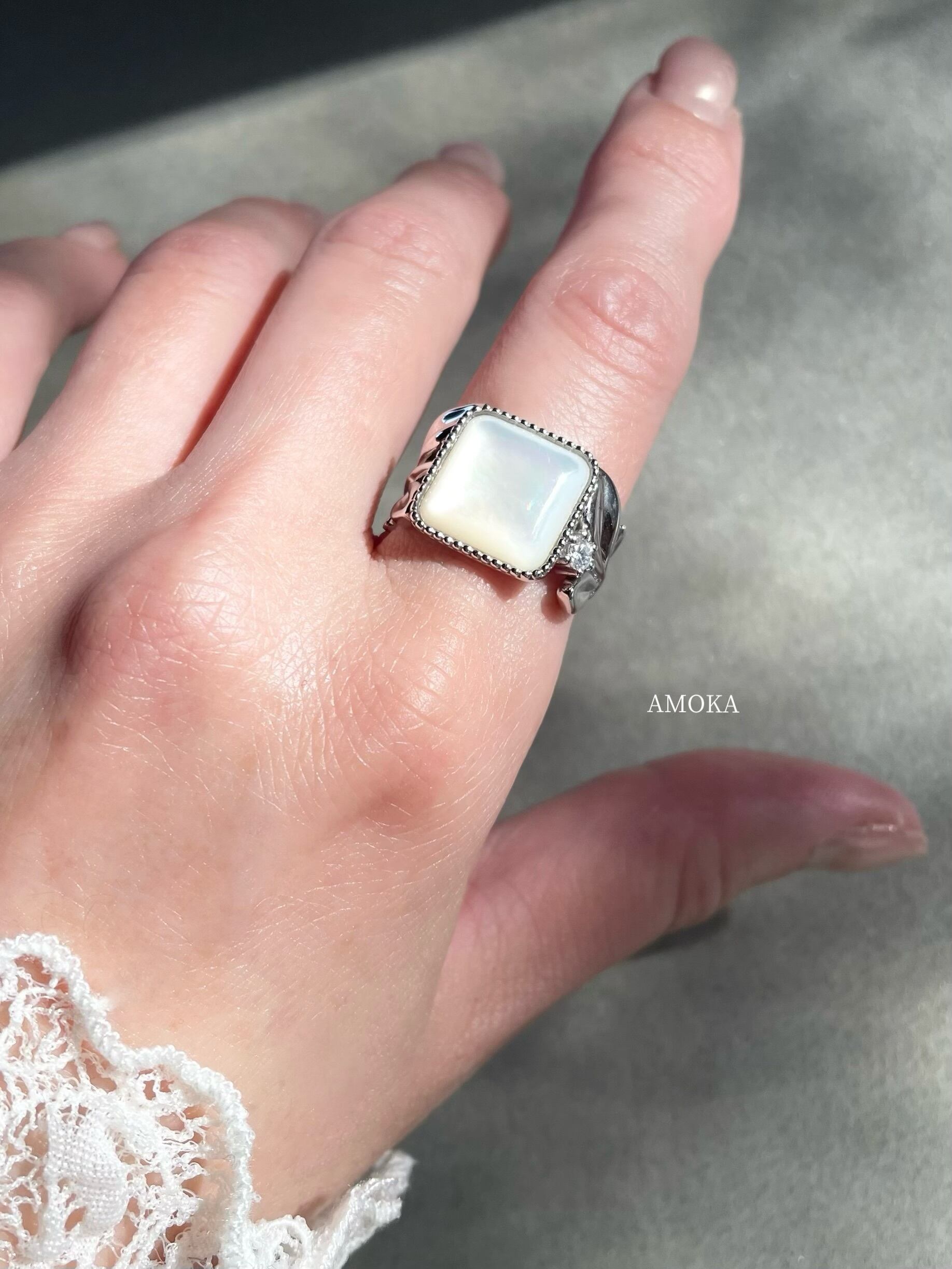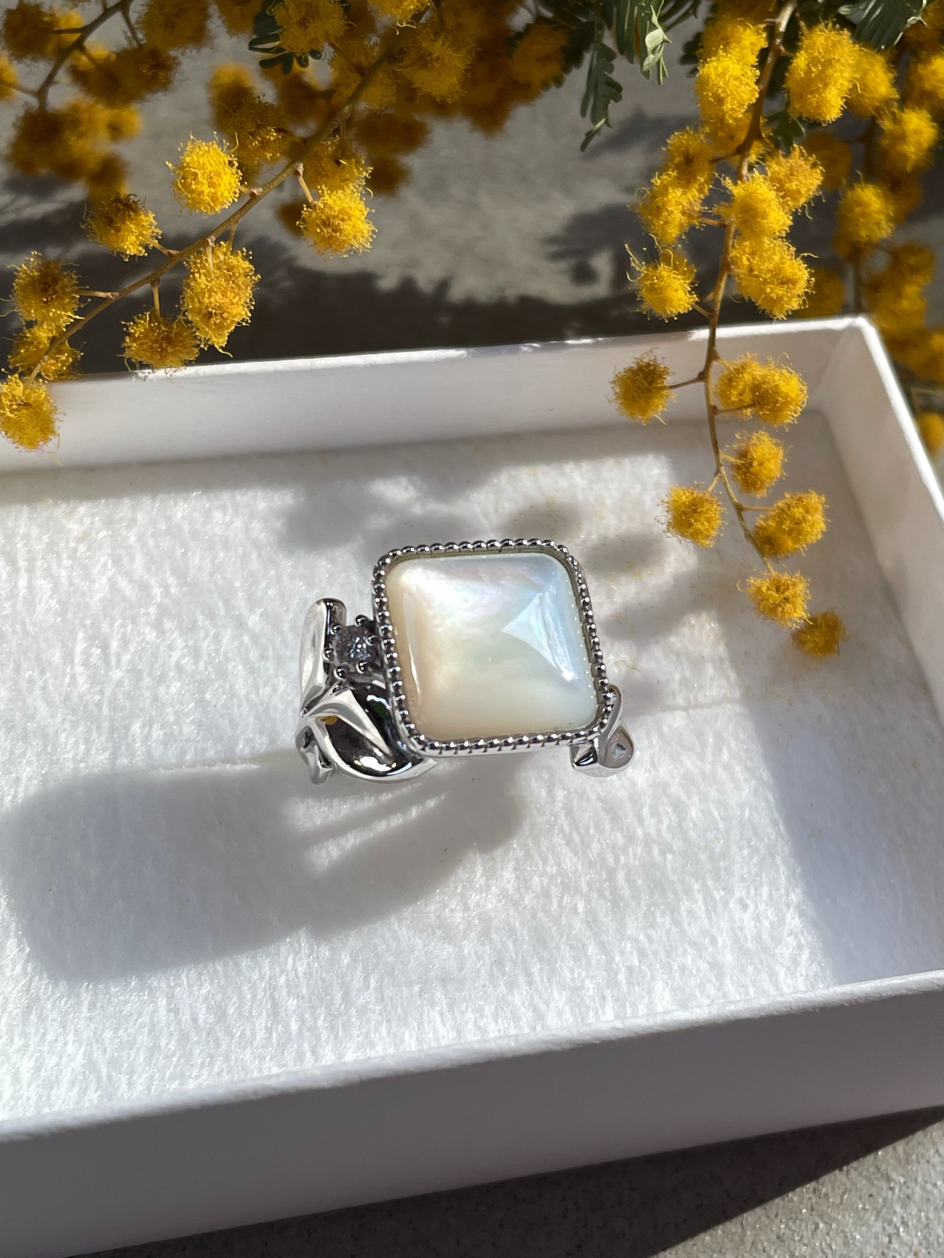 (大人のご褒美)Luminous Mother of Pearl & Diamond Eucalyptus Ring