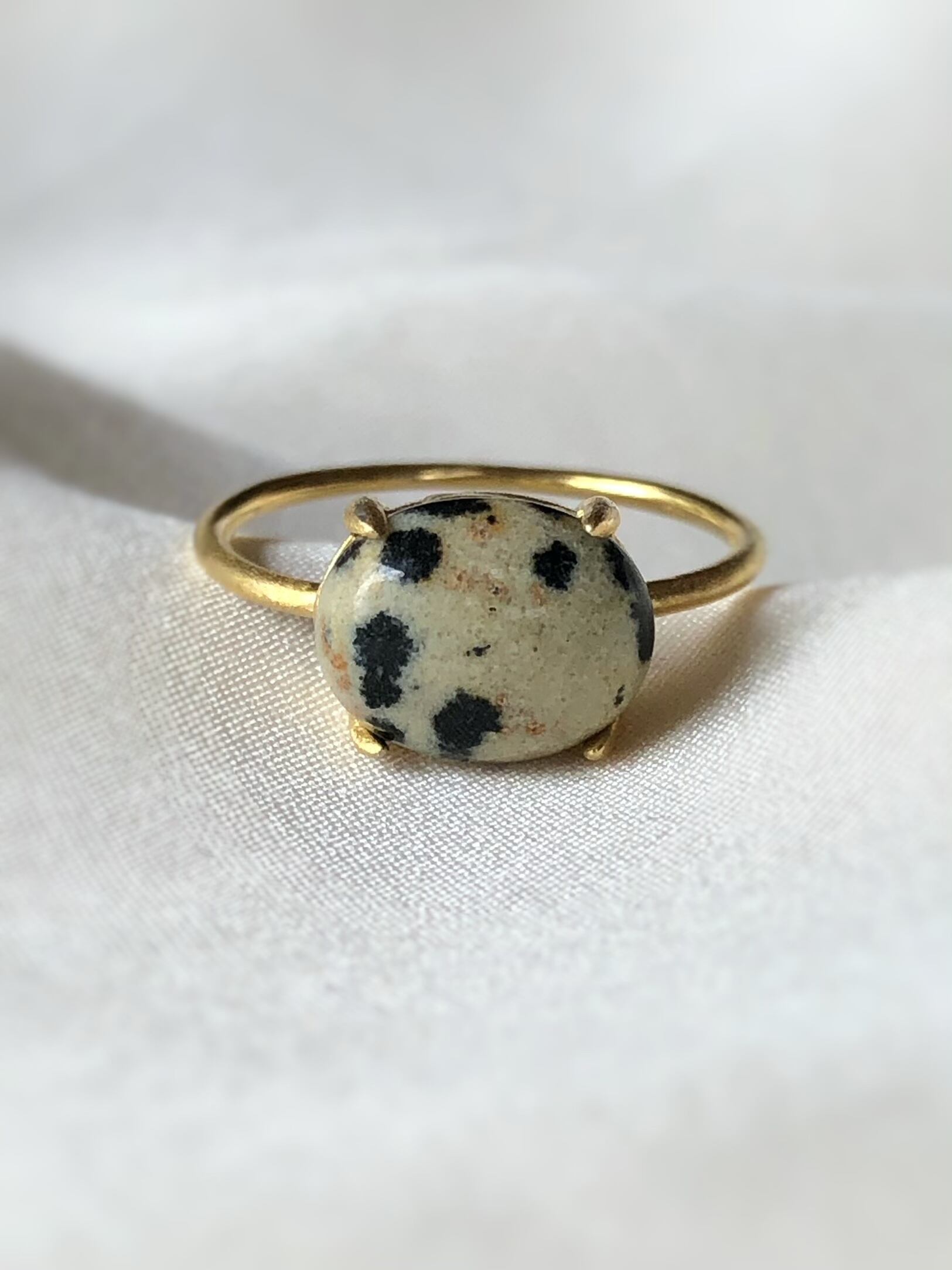 SILVER925製・18KGP仕上げの横長8×10ミリのダルメシアンジャスパーをセットし、シックで遊び心溢れる天然石リングをお作りしました。(縦長デザインも販売中です。)