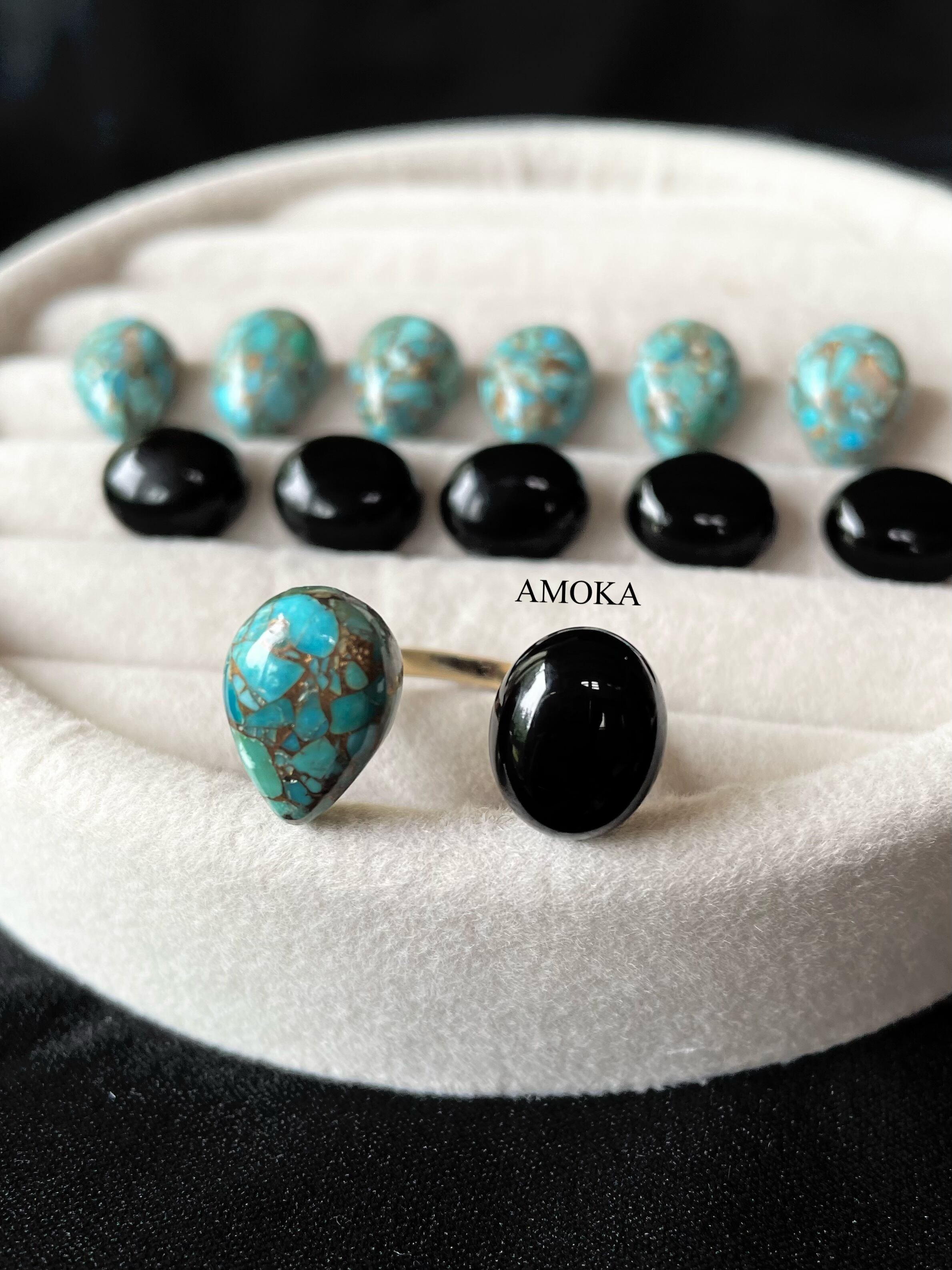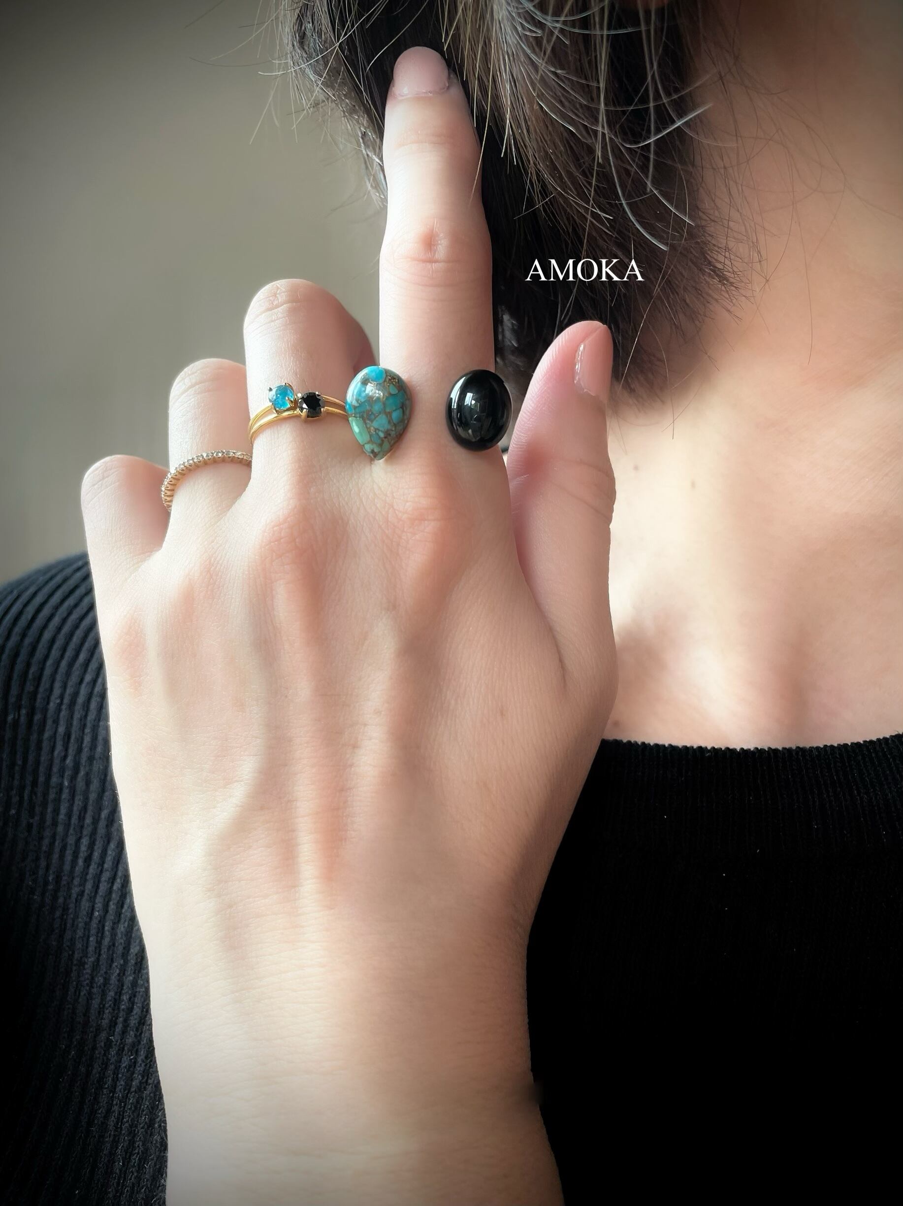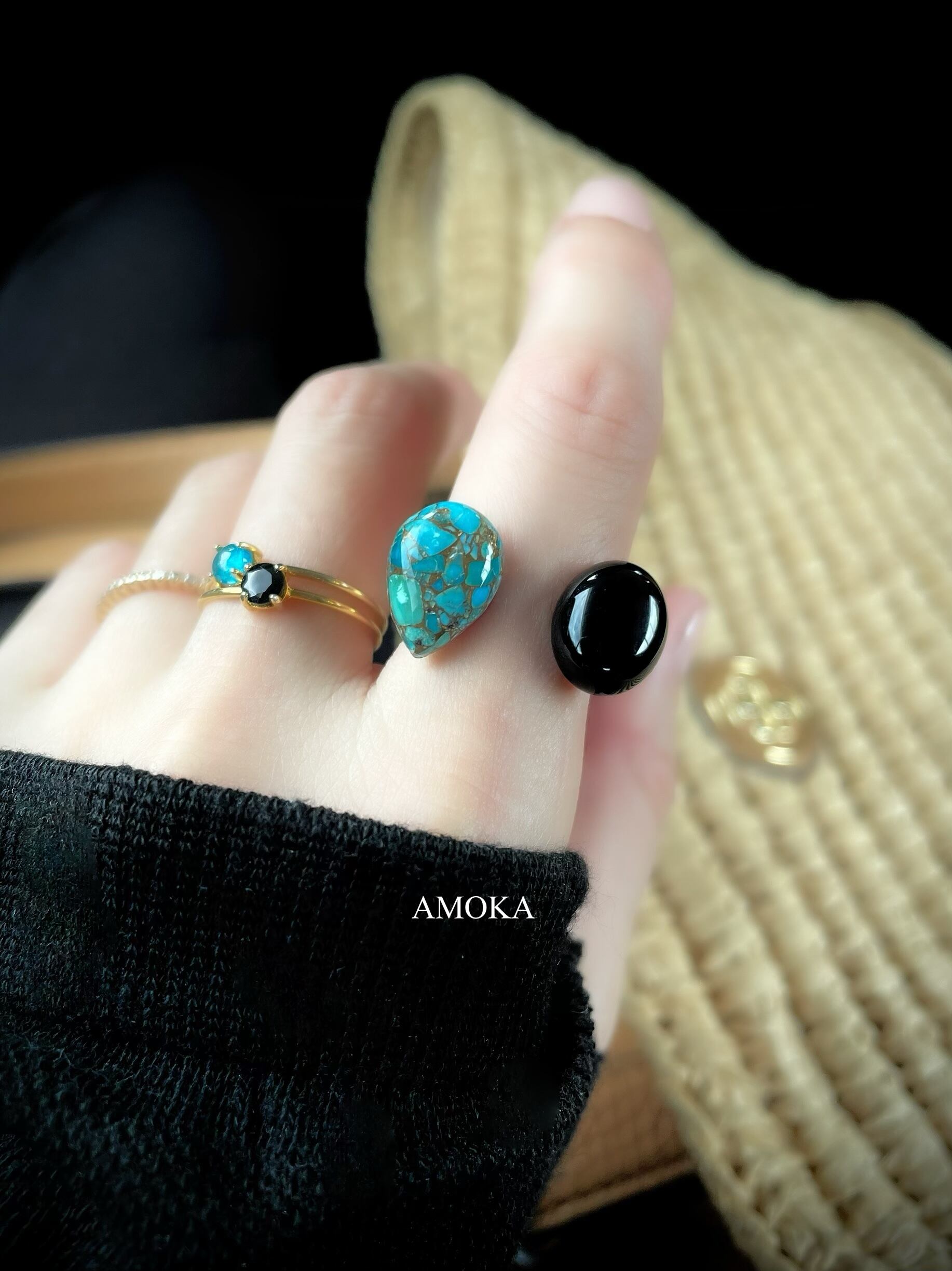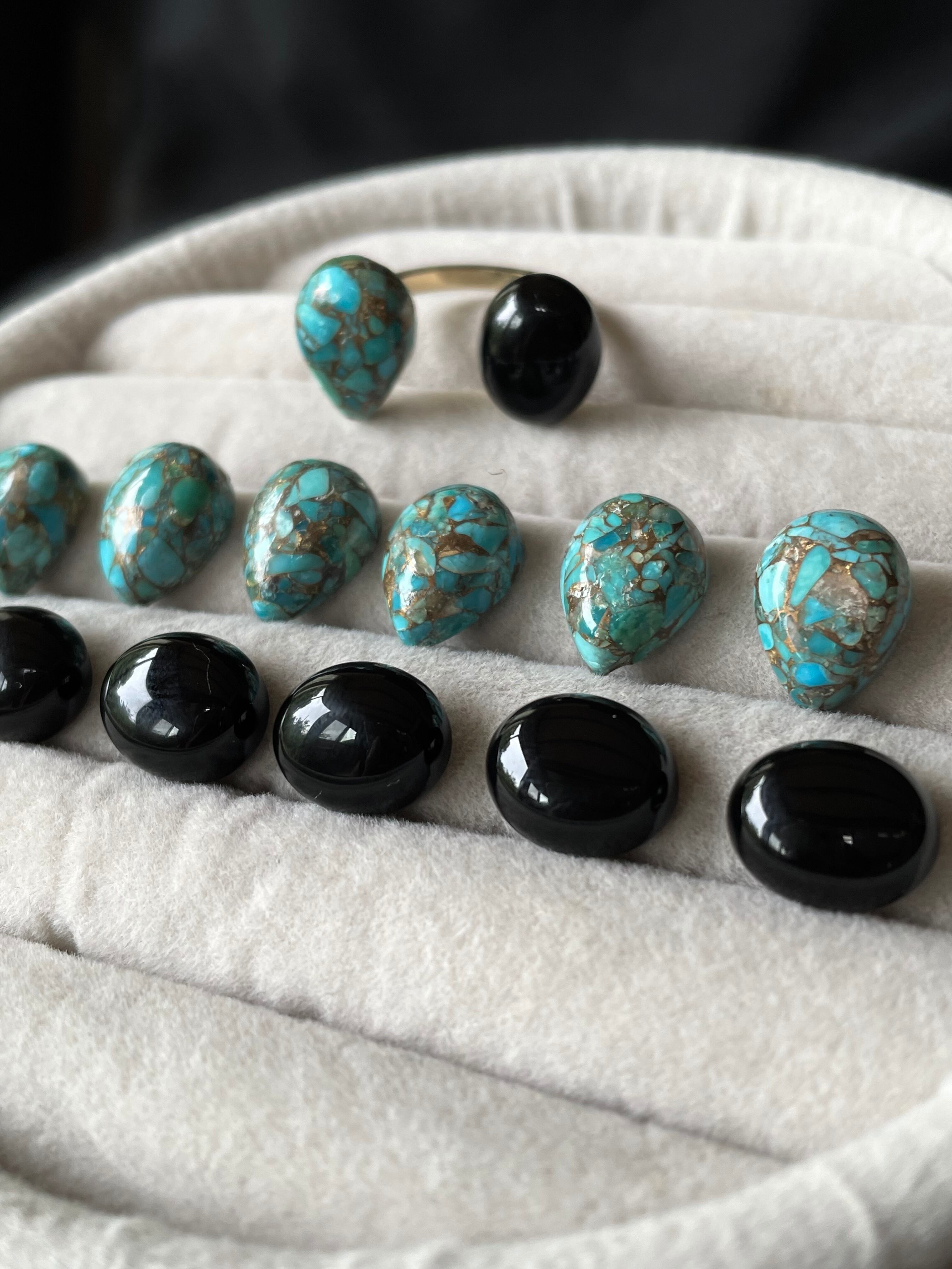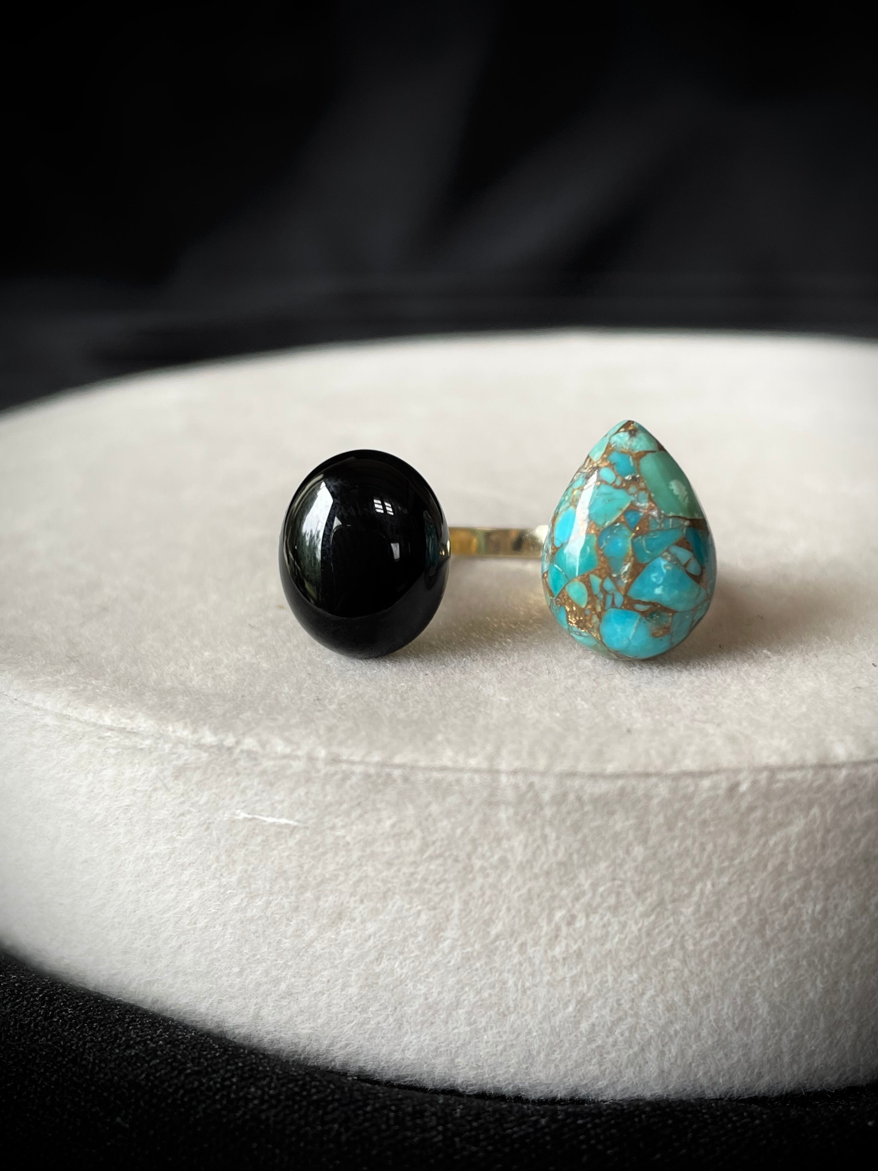 ブルーコッパーターコイズ(ターコイズと、銅を張り合わせたルース)とシックで可愛いブラックオニキスの2粒フォークリングをお作りしました。