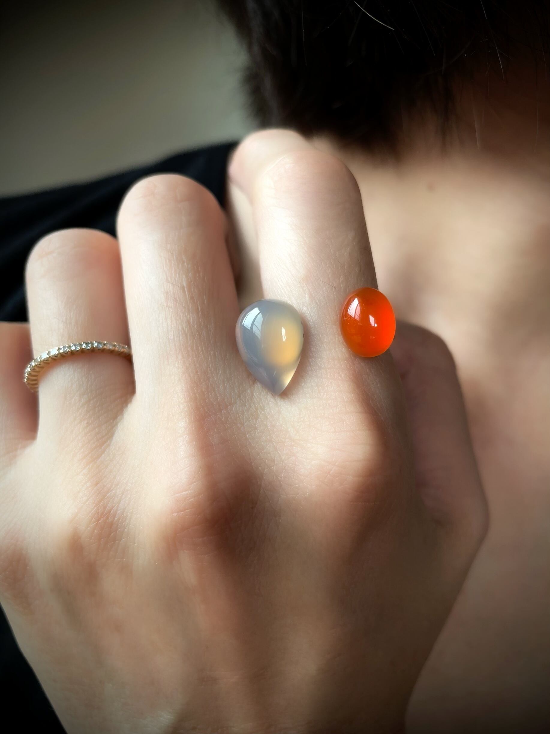 少し濃いめのカーネリアンを選別し、それに、優しいいろめのグレーオニキスをあわせることで、お互いのカラーの個性をひきたててくれます。