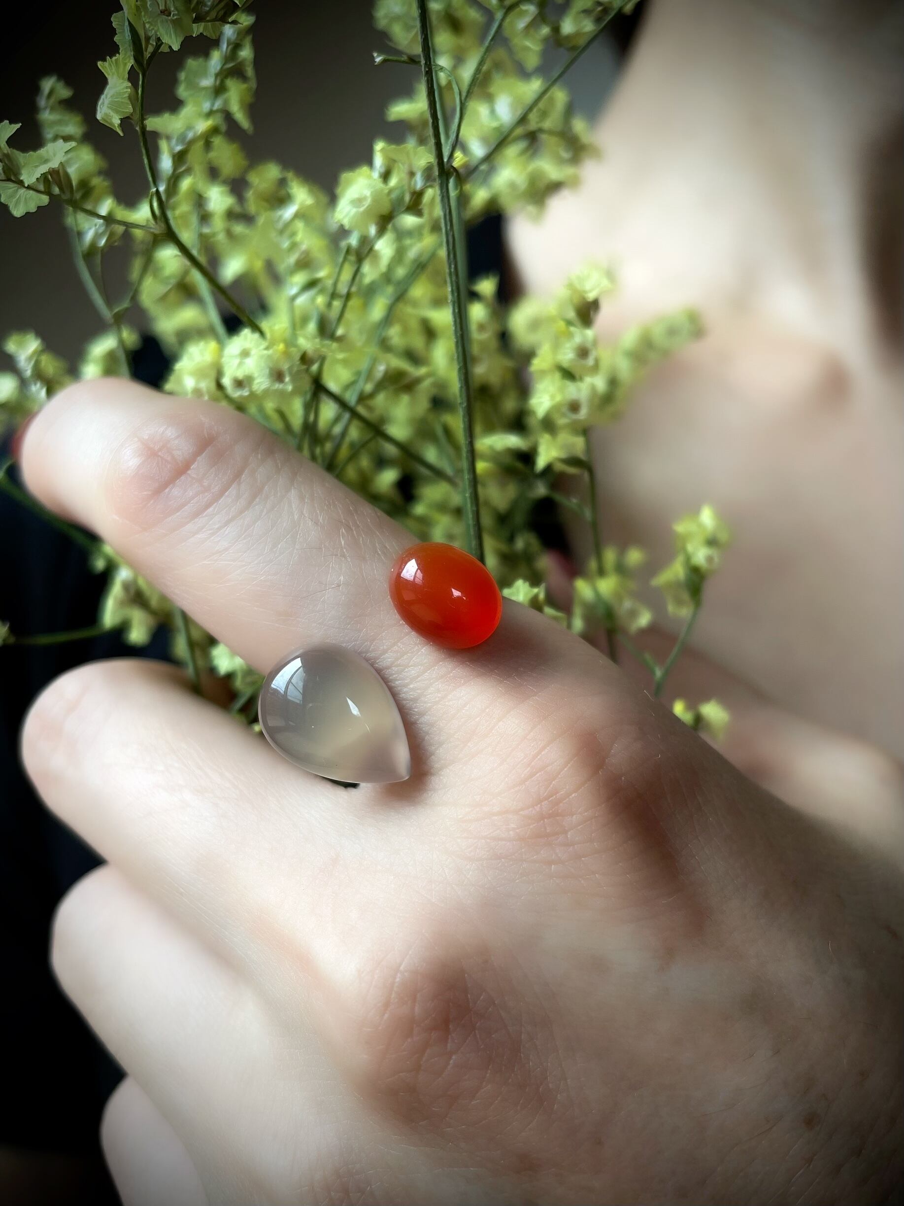 秋の紅葉を感じさせるカーネリアンと、淡いグレーがとてもシックな印象のグレーオニキスのフォークリングをお作りしました。