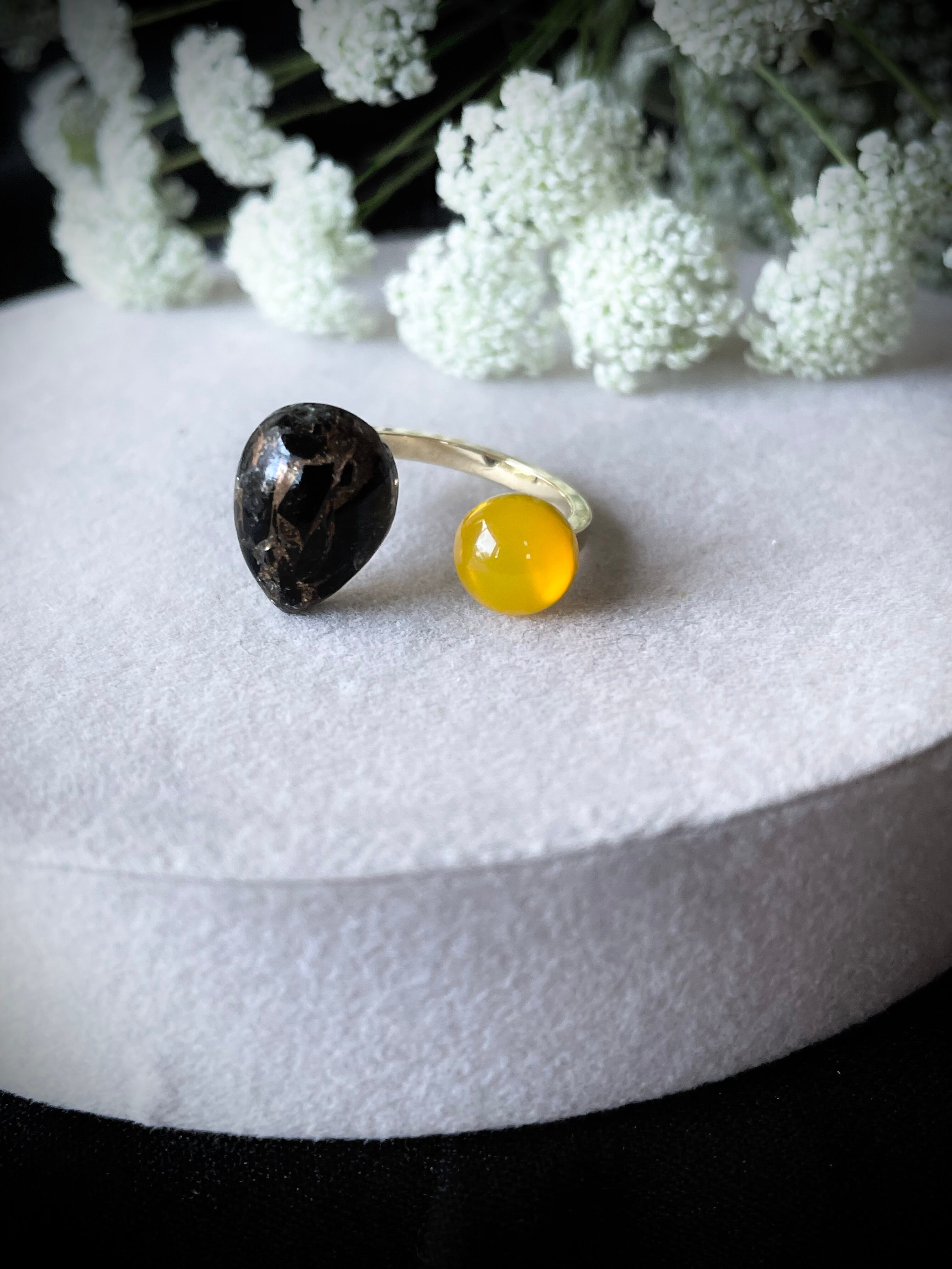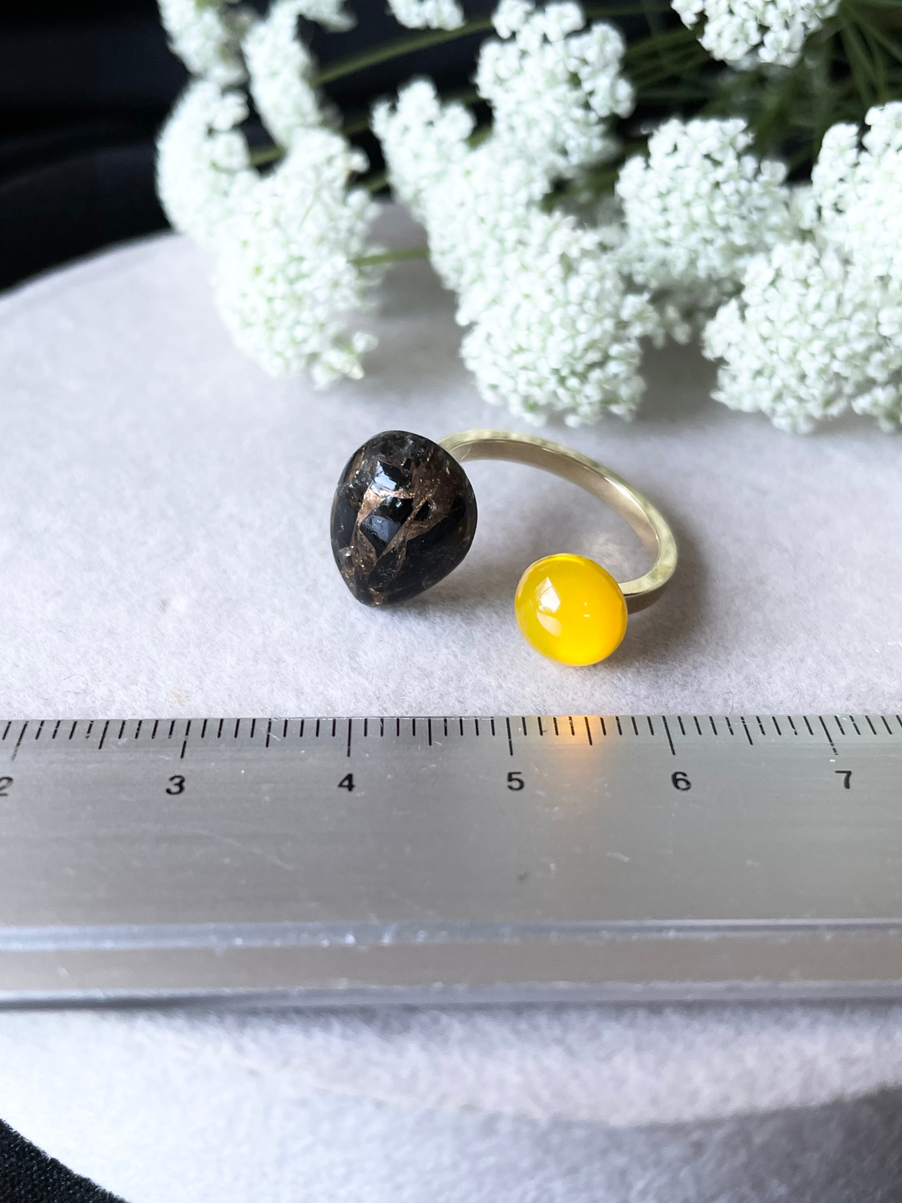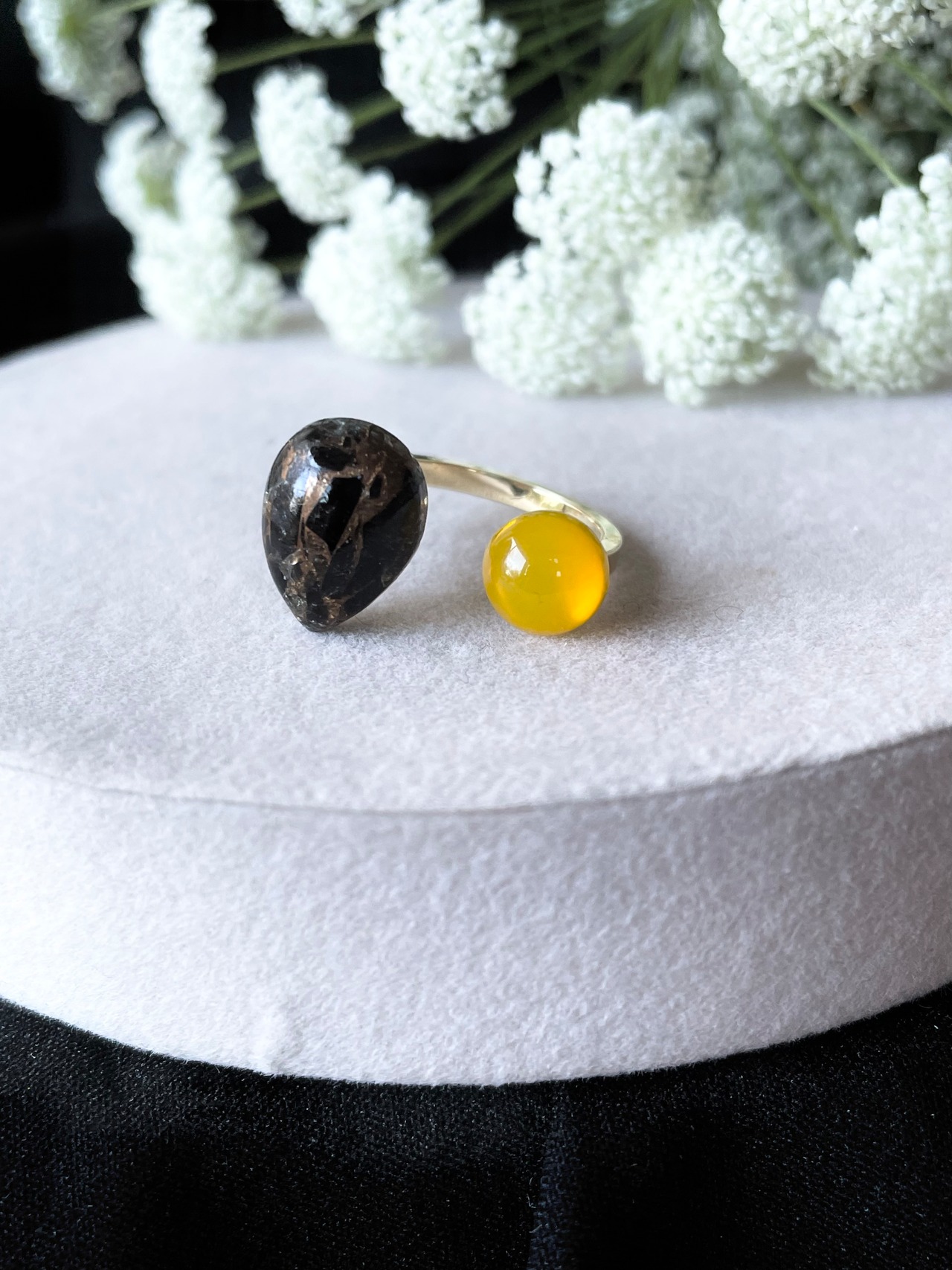 ブラックコッパーオブシディアン(ブラックカッパーオブシディアン)×イエローアゲートのフォークリングをお作りしました。