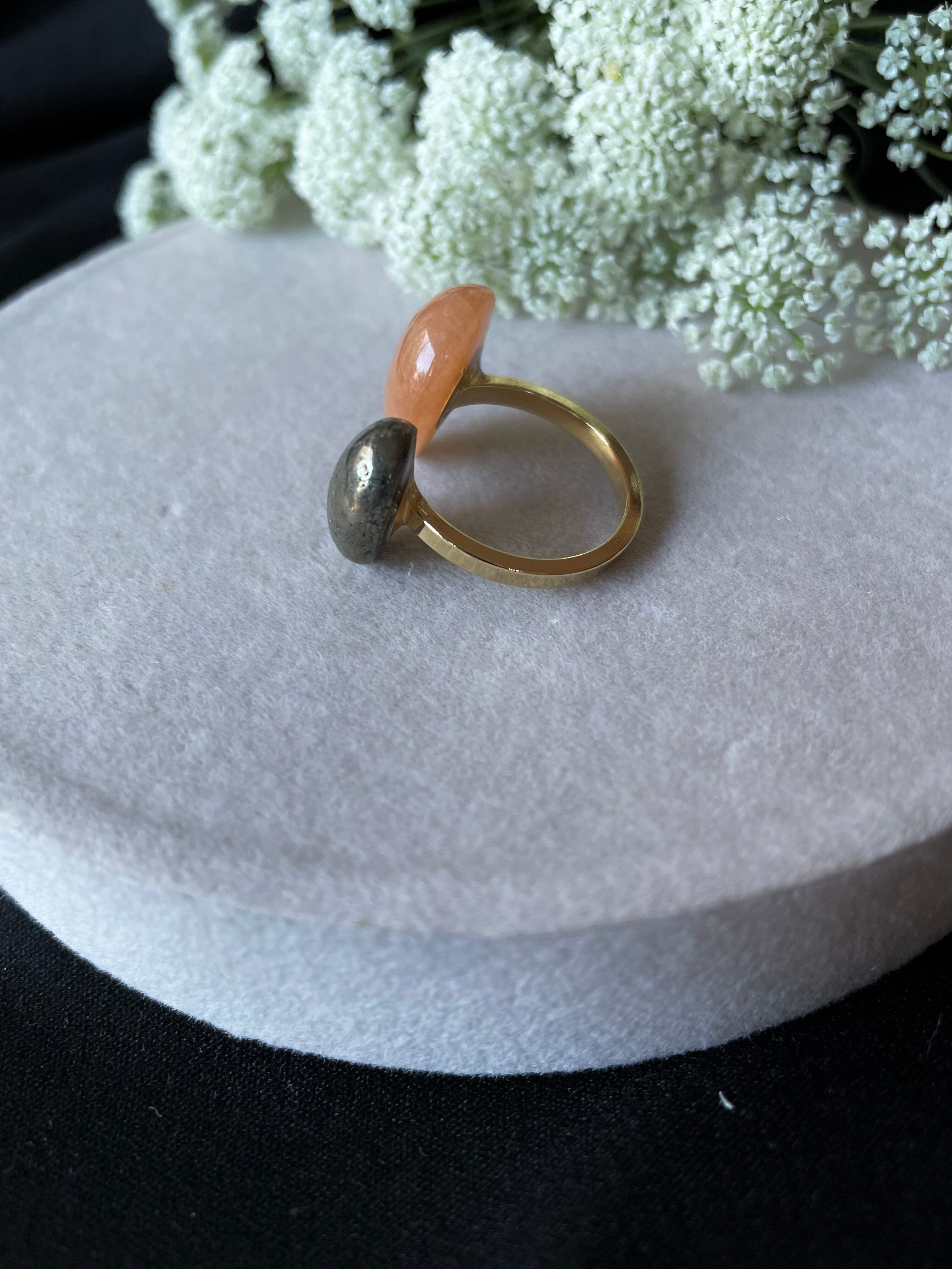 メタリックな質感がクールなパイライトと、しっとり落ち着いたくすみオレンジが魅力のオレンジムーンストーンの2粒フォークリングをお作りしました。