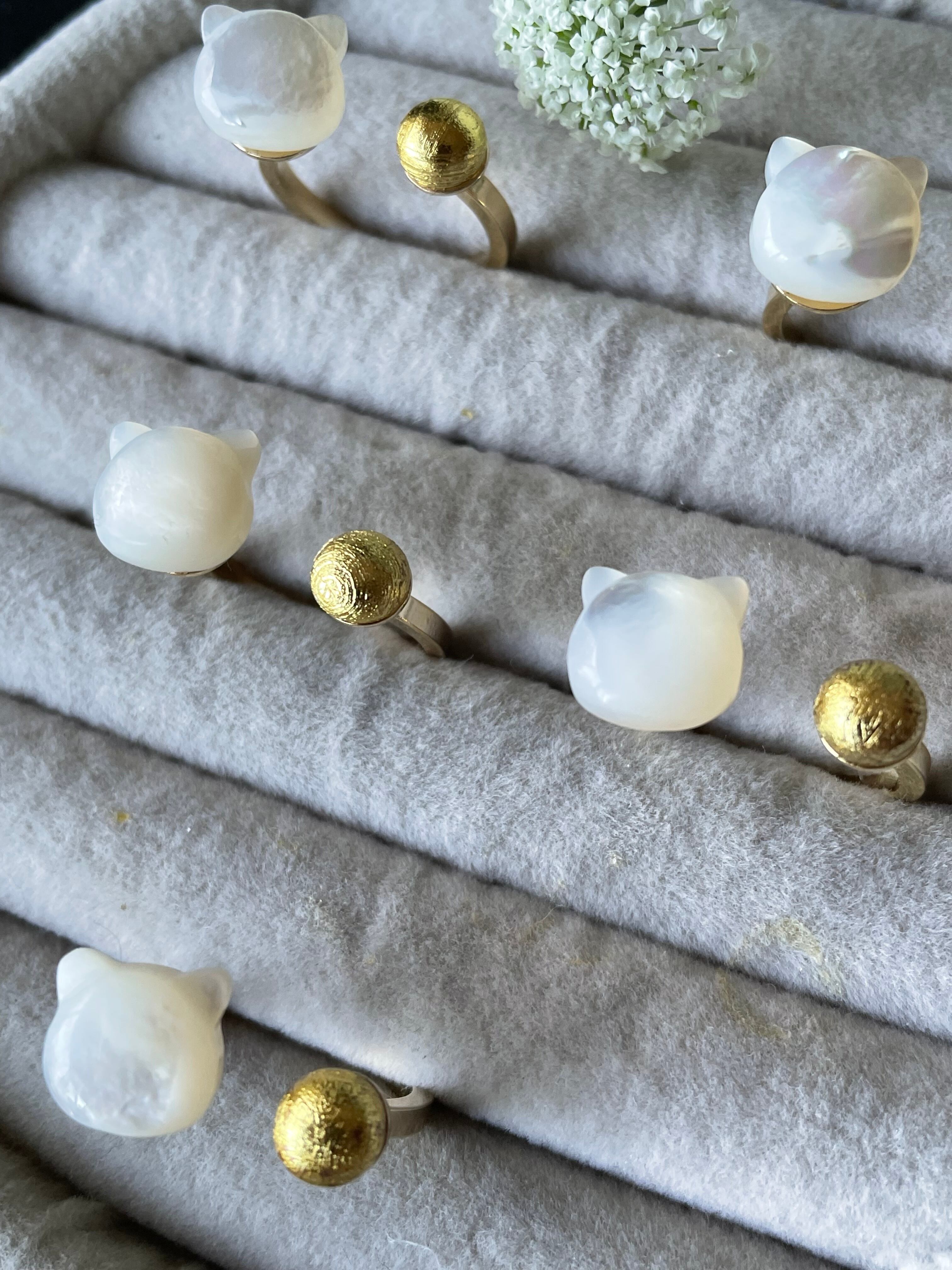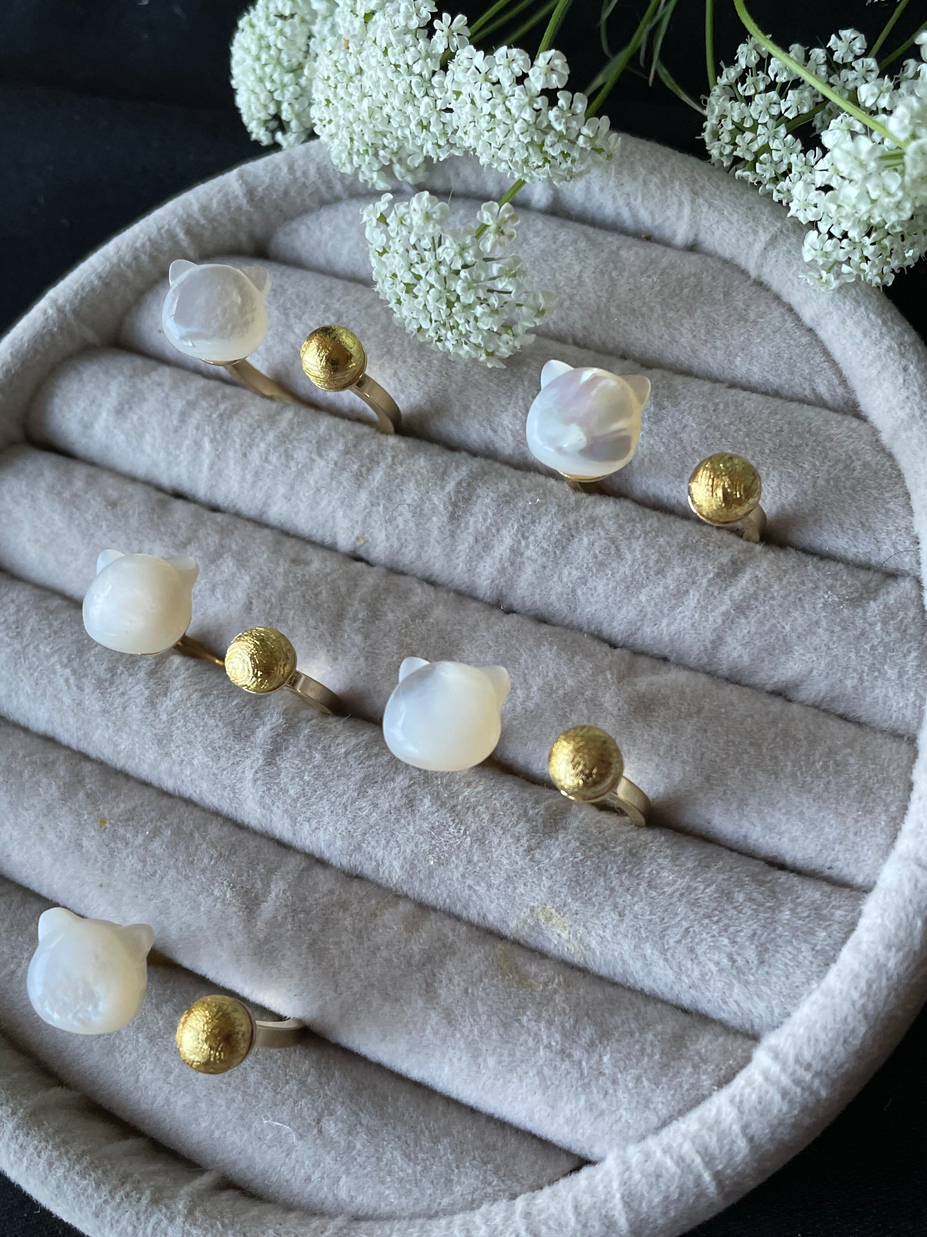 マザーオブパール(白蝶貝)は「自分磨き」「美」「癒し」「絆」などの意味があります。ぷっくり可愛いネコ型が上品さに個性をプラスしてくれます。
