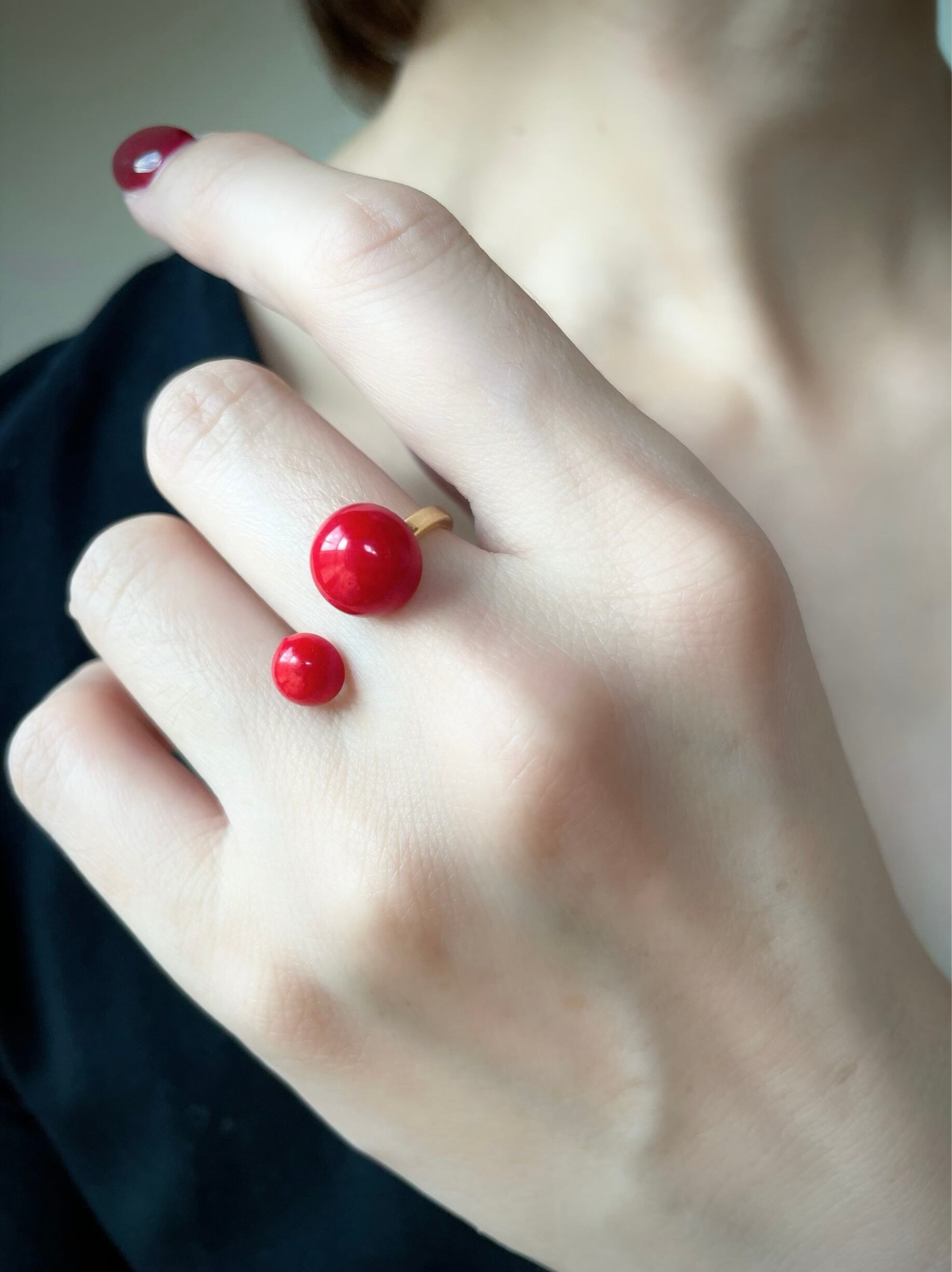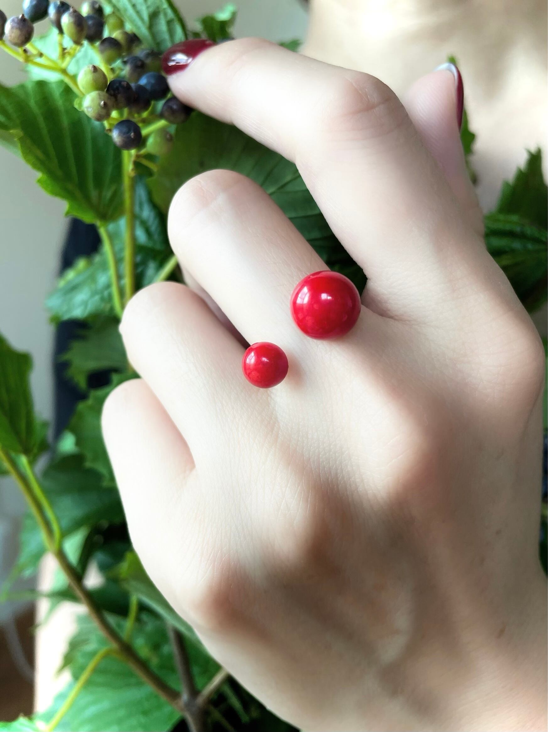 赤×赤のコーディネートが目を引く大人可愛いフォークリングをお作りしました。 コーディネートのポイントづかいに人気の赤珊瑚(染め)は季節、年齢などを問わず人気をいただいております。