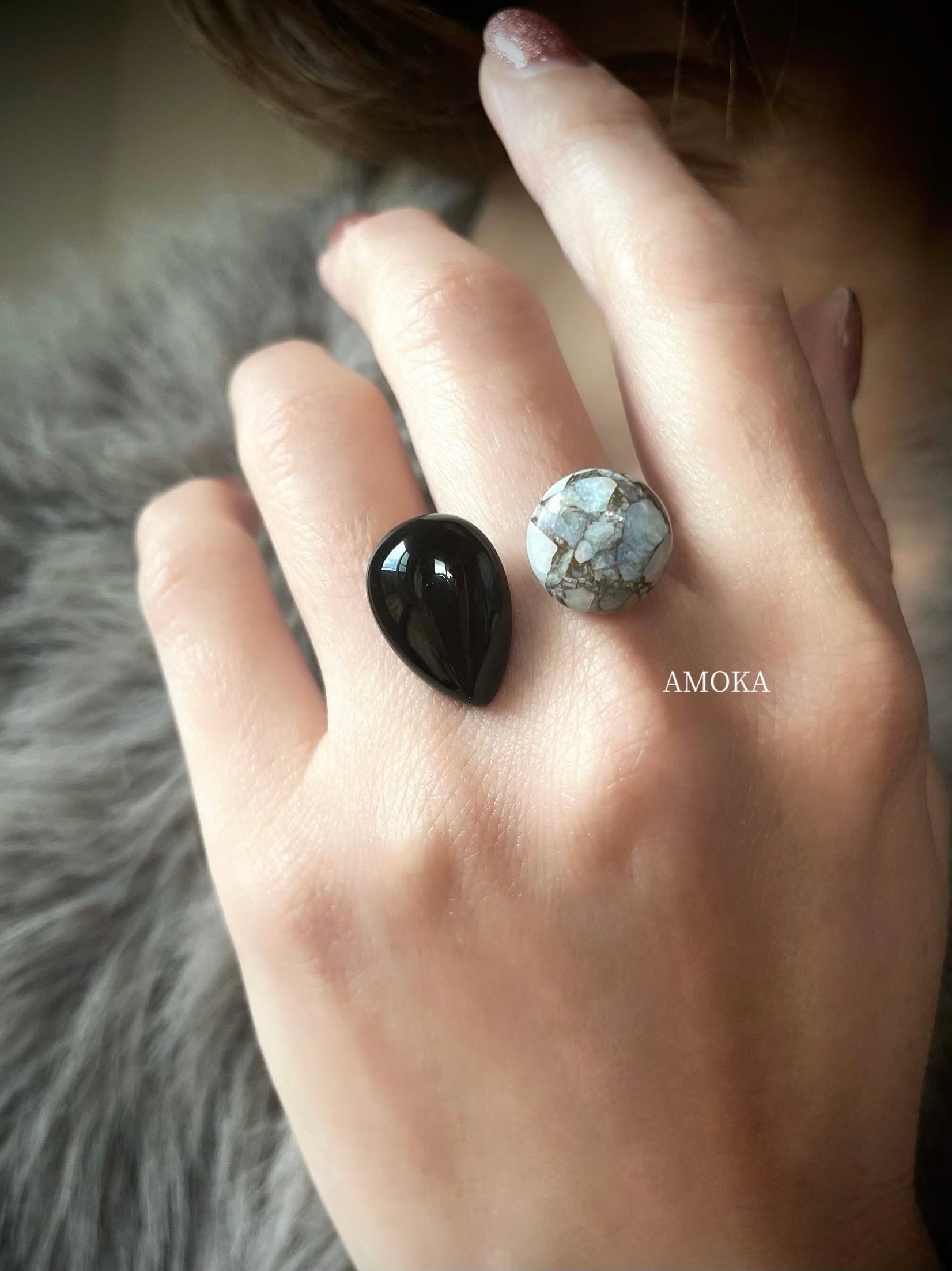 コッパーオパール(オパールと、銅を張り合わせたルース)とシックで可愛いブラックオニキスの2粒フォークリングをお作りしました。