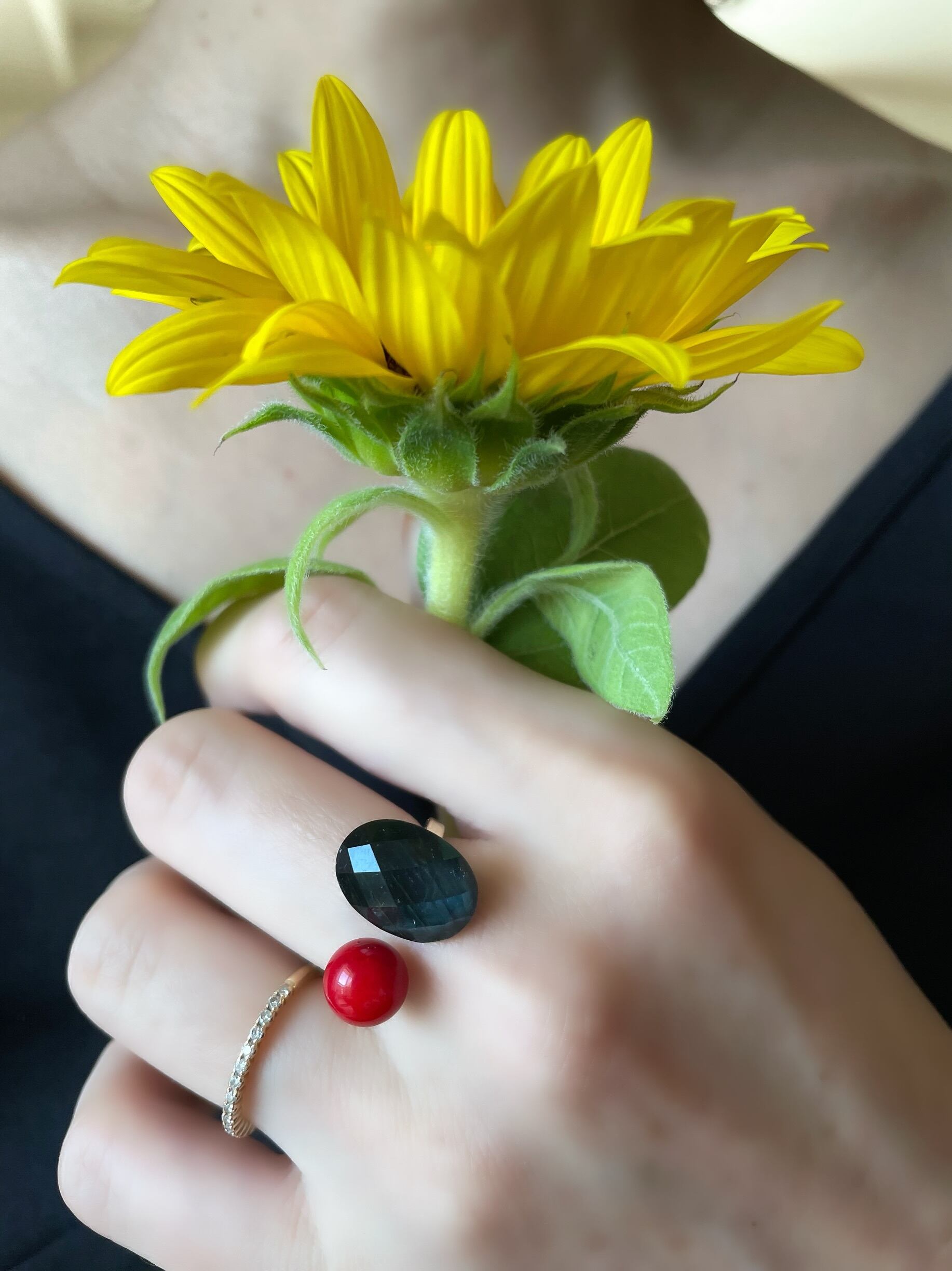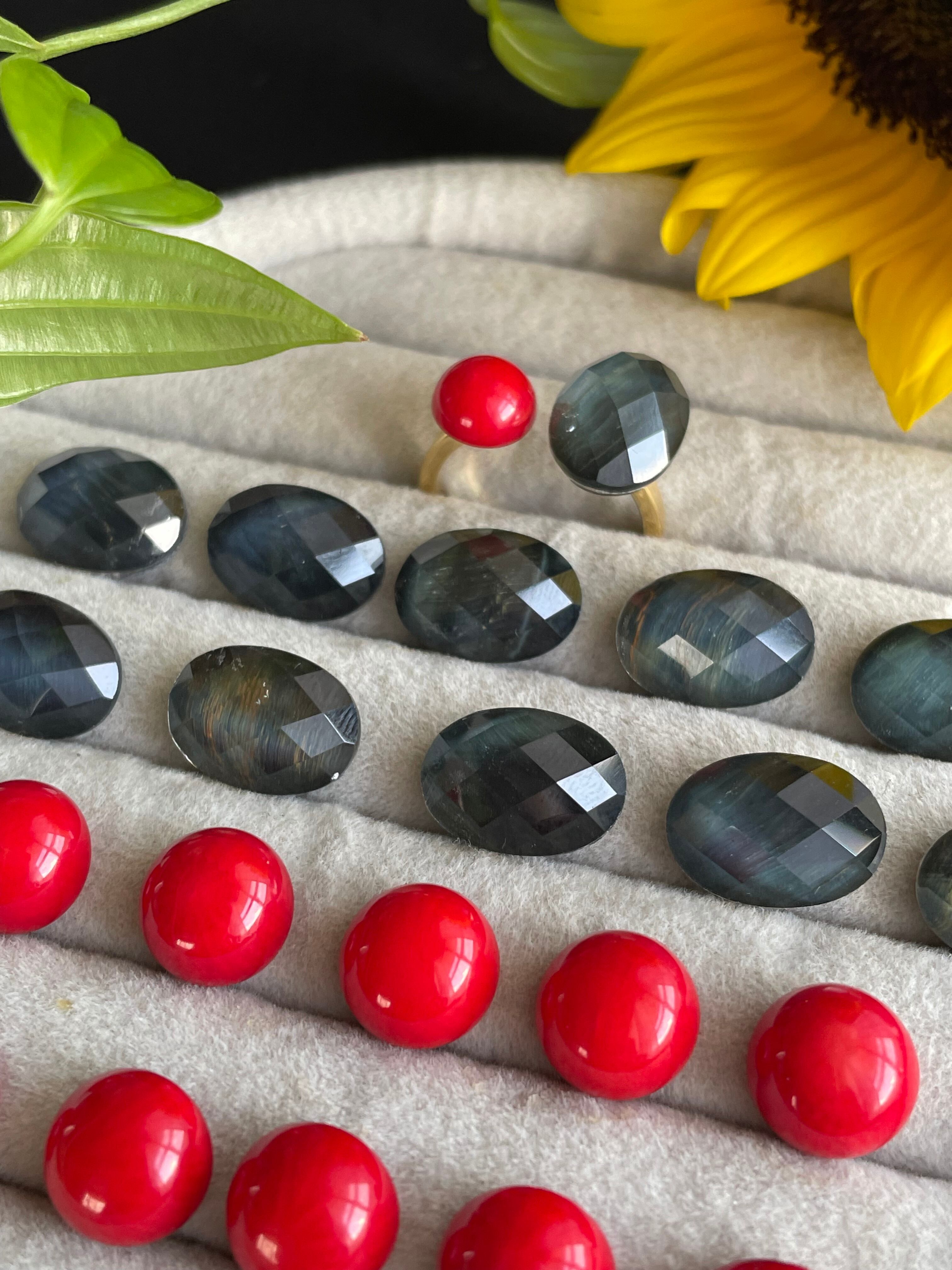 *(ブルータイガーアイ×クリスタル)×(赤珊瑚(染め))のフォークリングをお作りしました。ブルータイガーアイ×クリスタルとは...美しいブルータイガーアイを台座にして、 その上にカット入りのクリスタル(天然水晶)を重ねたダブレットタイプのカボションです。