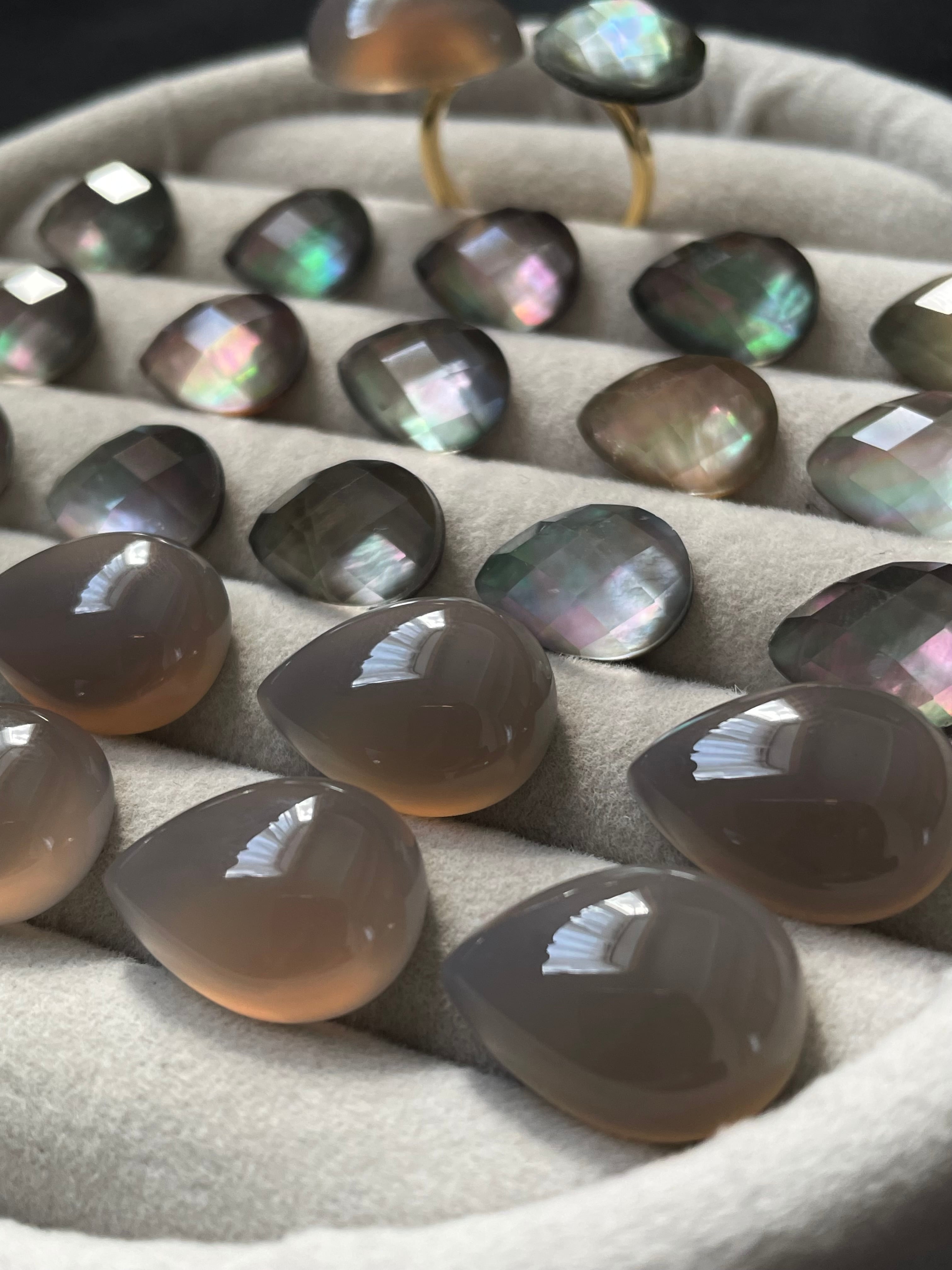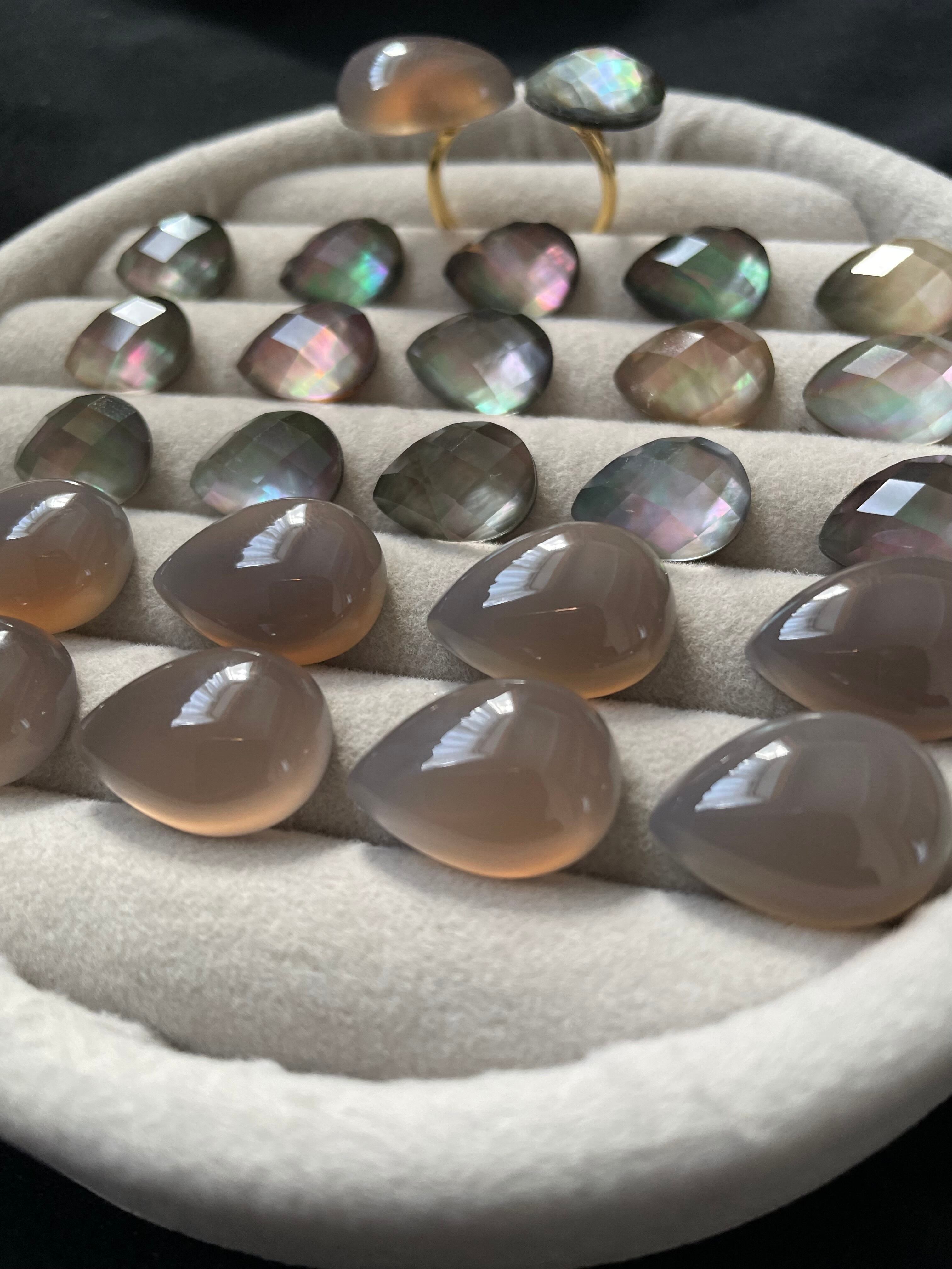 美しいブラックシェル(黒蝶貝)を台座に、カット入りのクリスタル(天然水晶)が重ねられたダブレットタイプのカボションです。 シェル特有の上質な照りがクリスタルから透けて動くたびに虹色に輝きます。