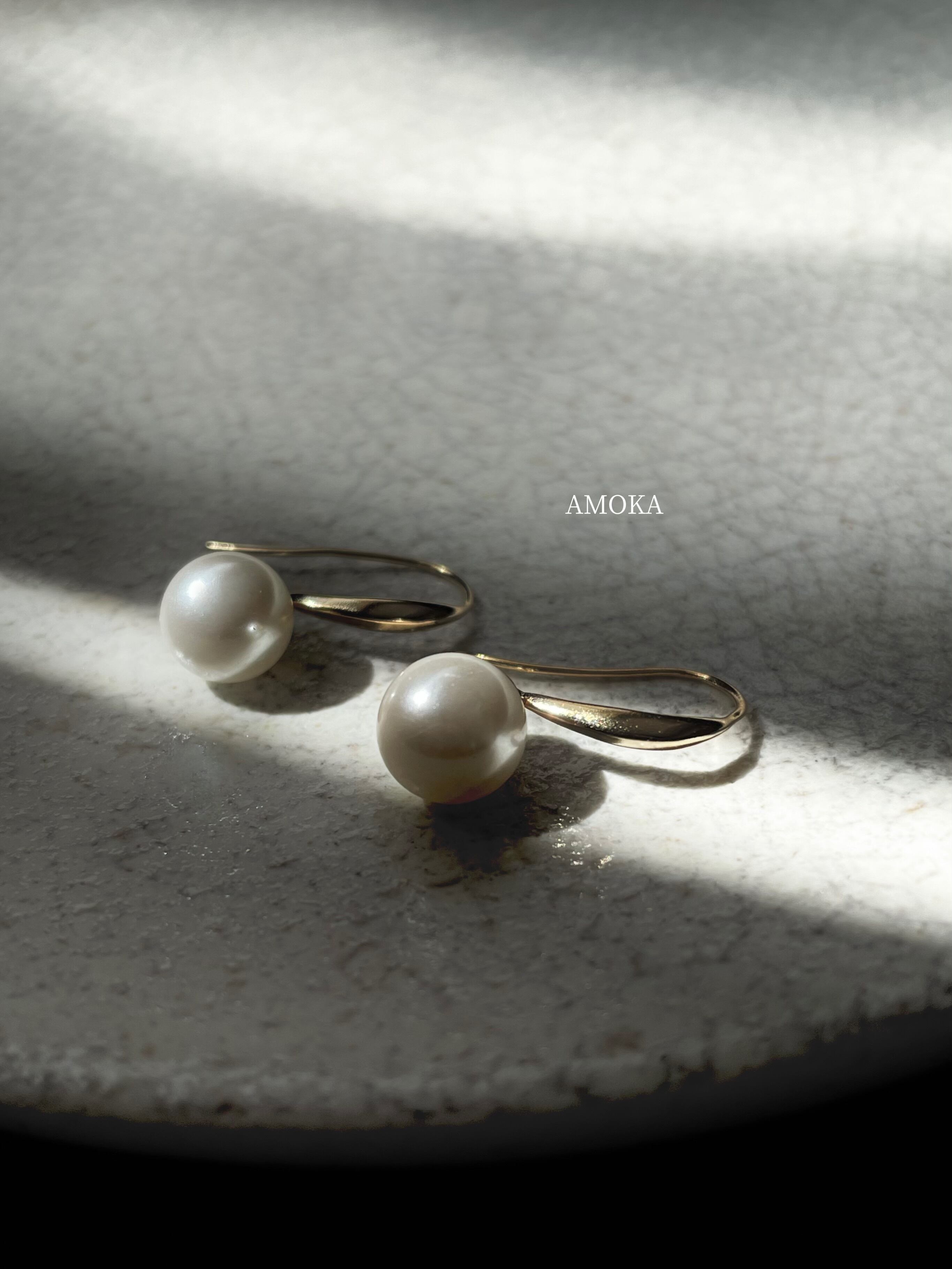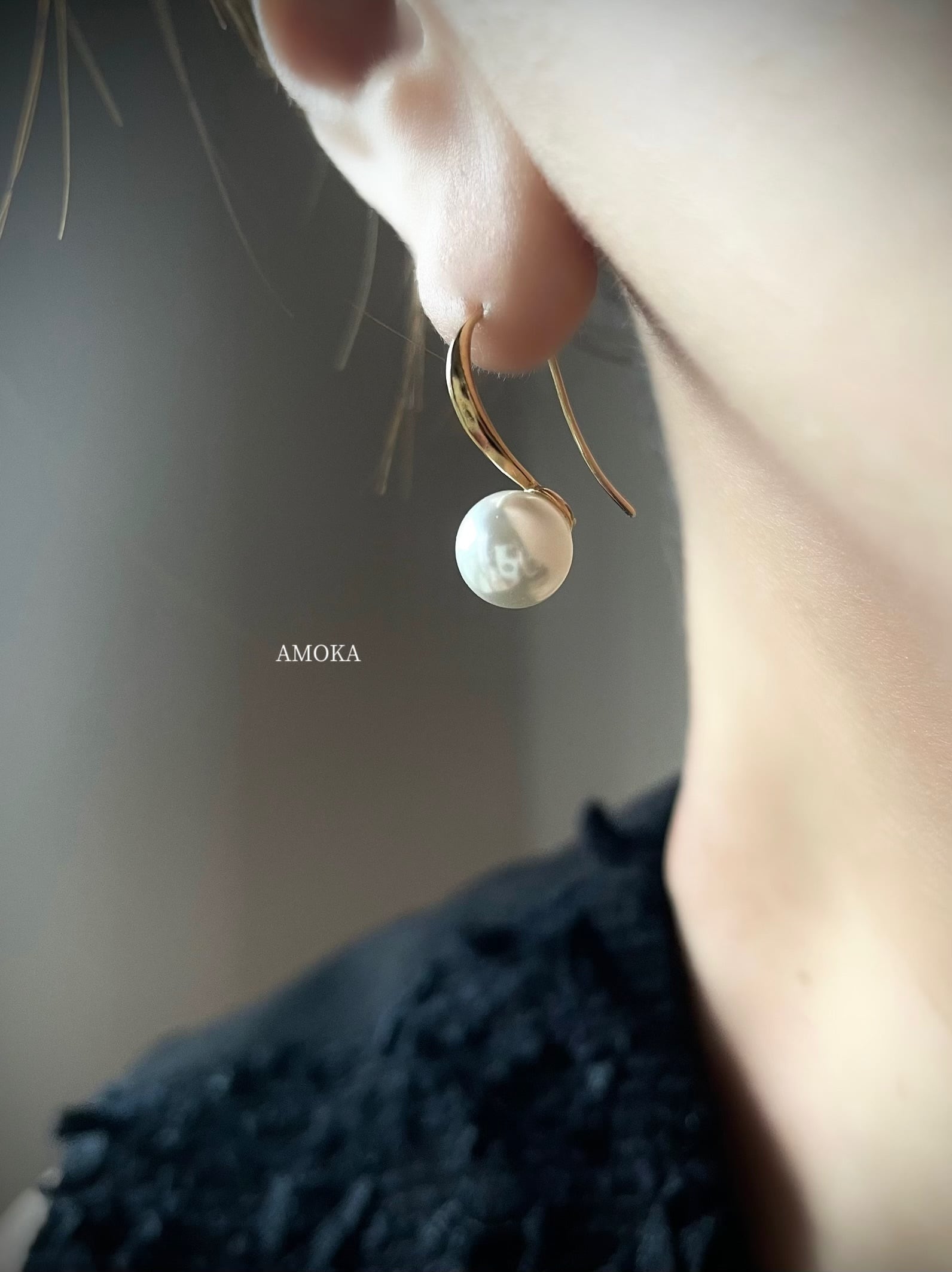 照艶の美しい8ミリのマザーオブパールデザインピアスです。流れるようなデザインフックピアスにマザーオブパールの白がとても映えるお品です。