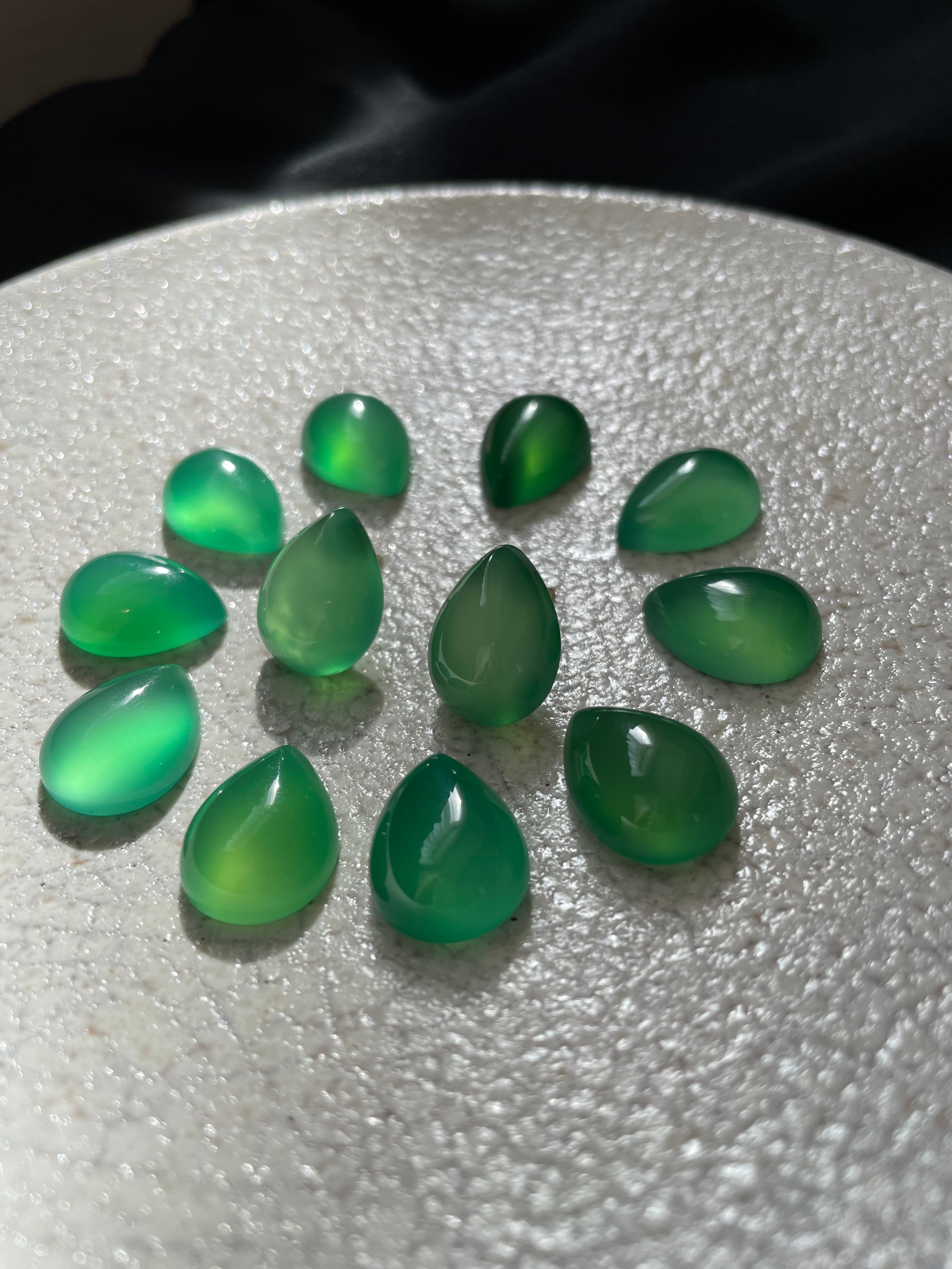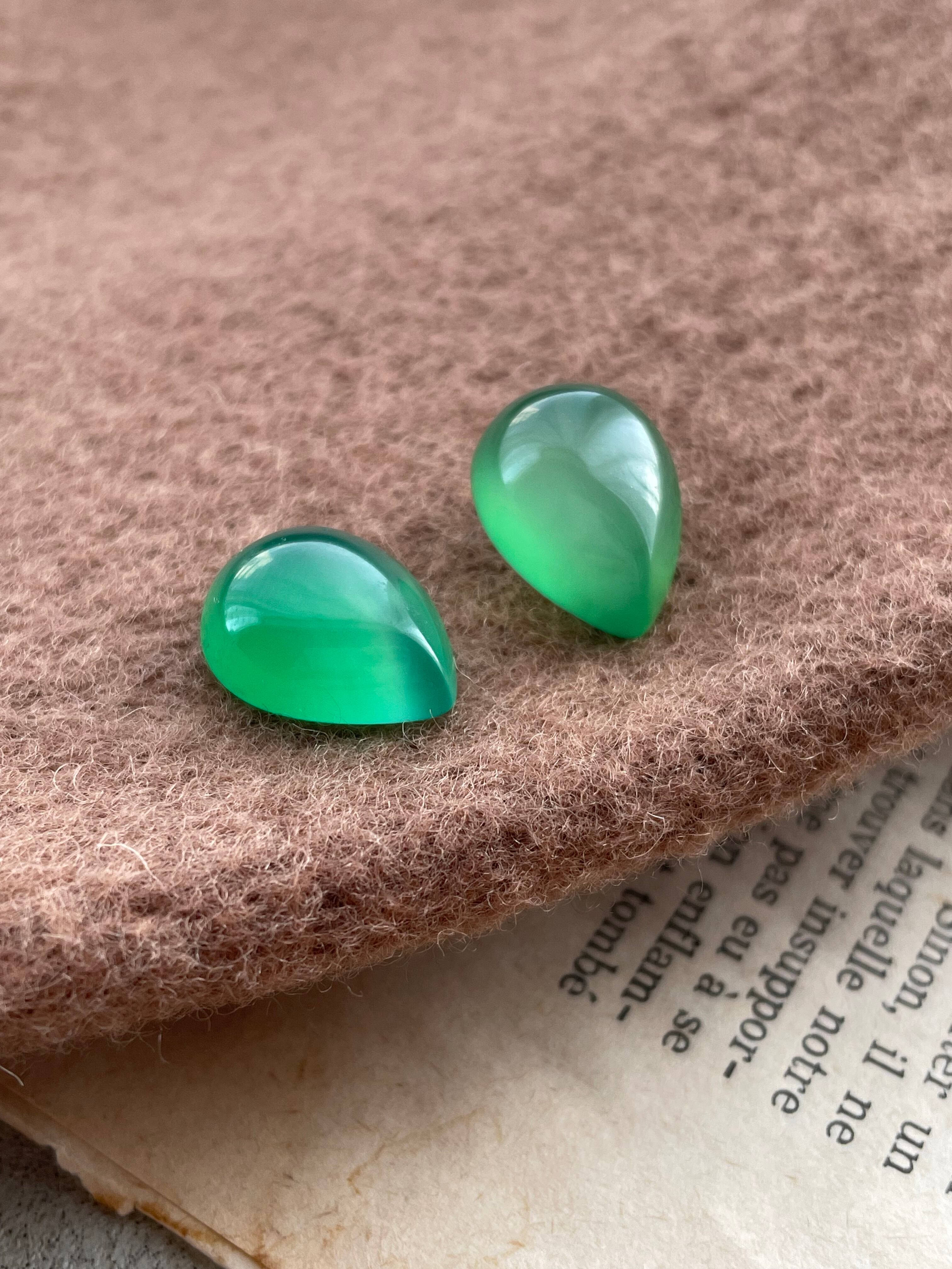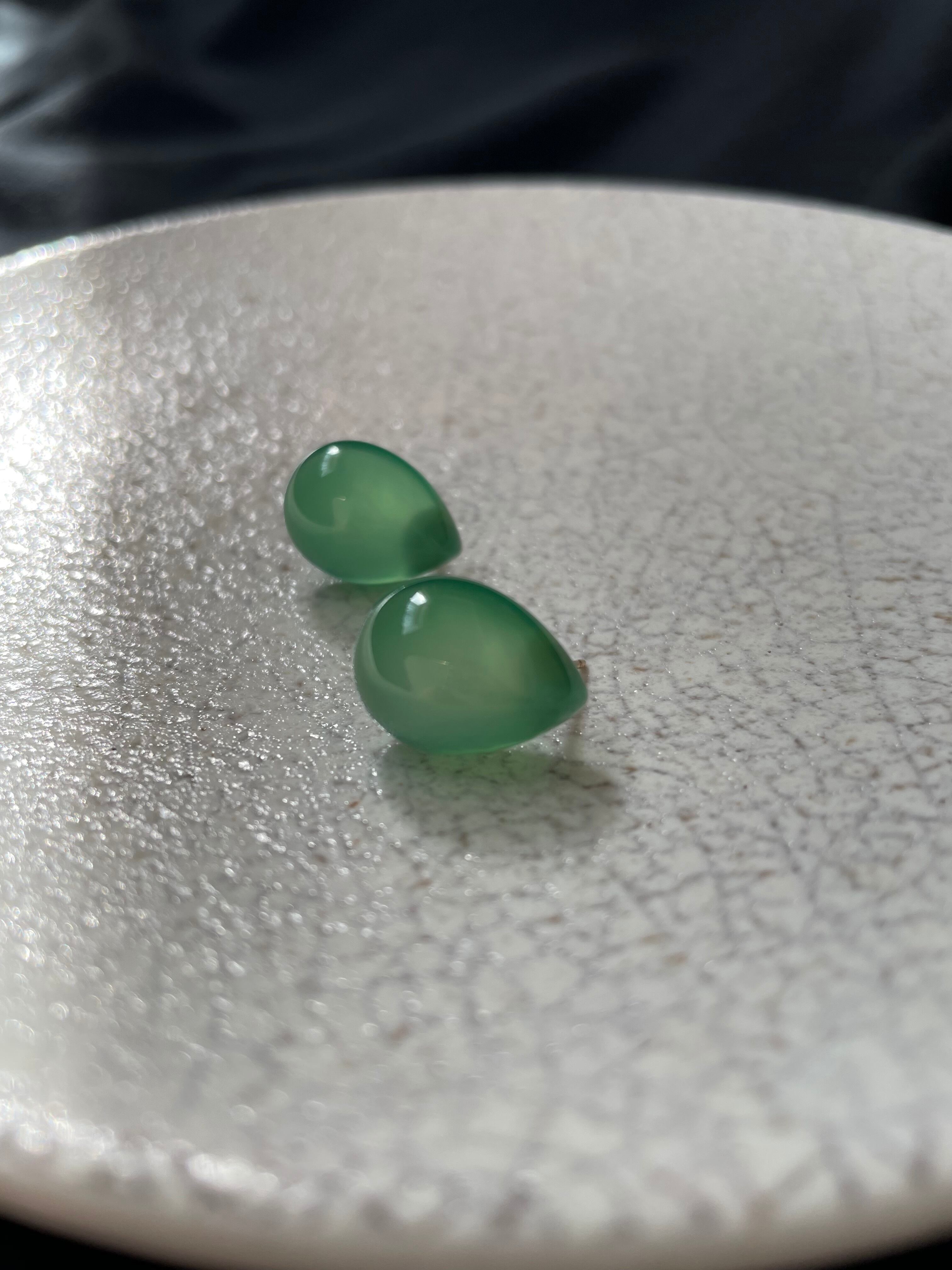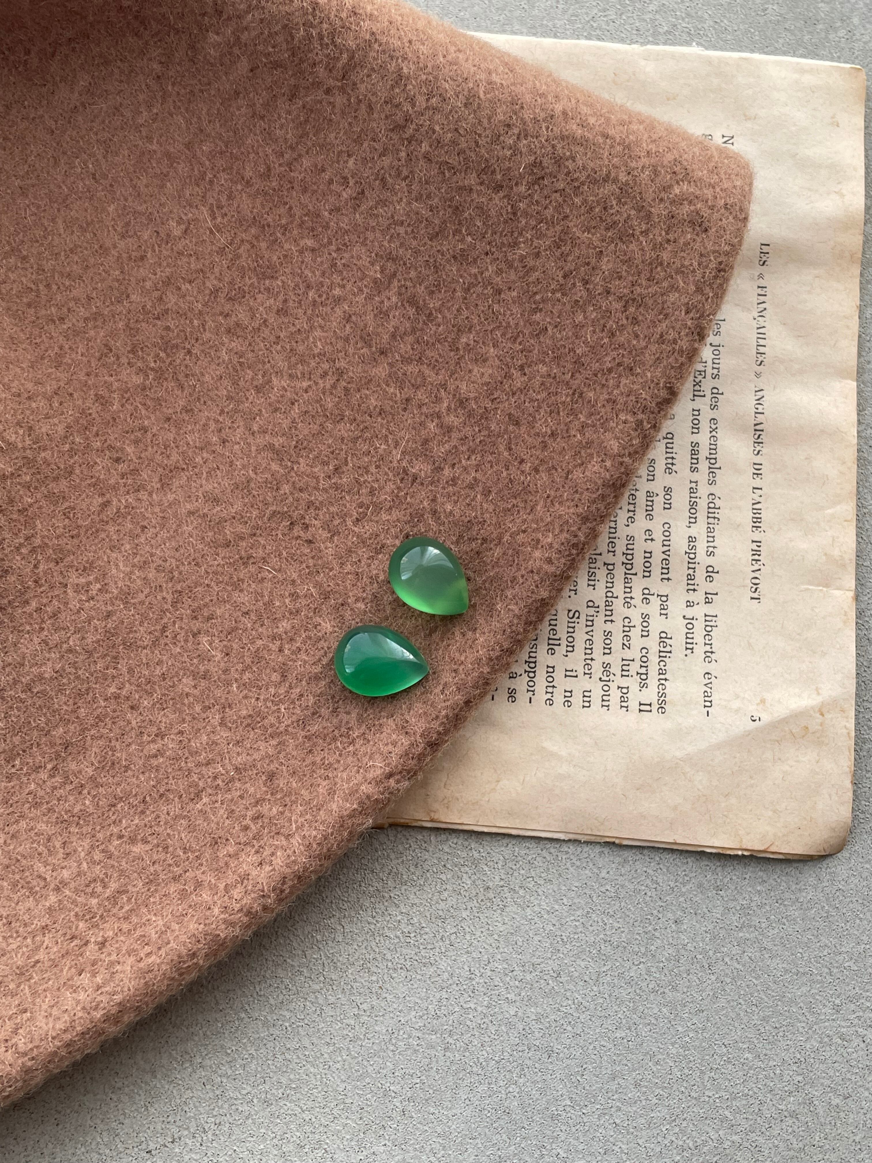 瑞々しい雫のようなペアシェイプカットのグリーンオニキスを、肌なじみのよい**14kgf(ゴールドフィルド)**のフックにあしらったピアスです。