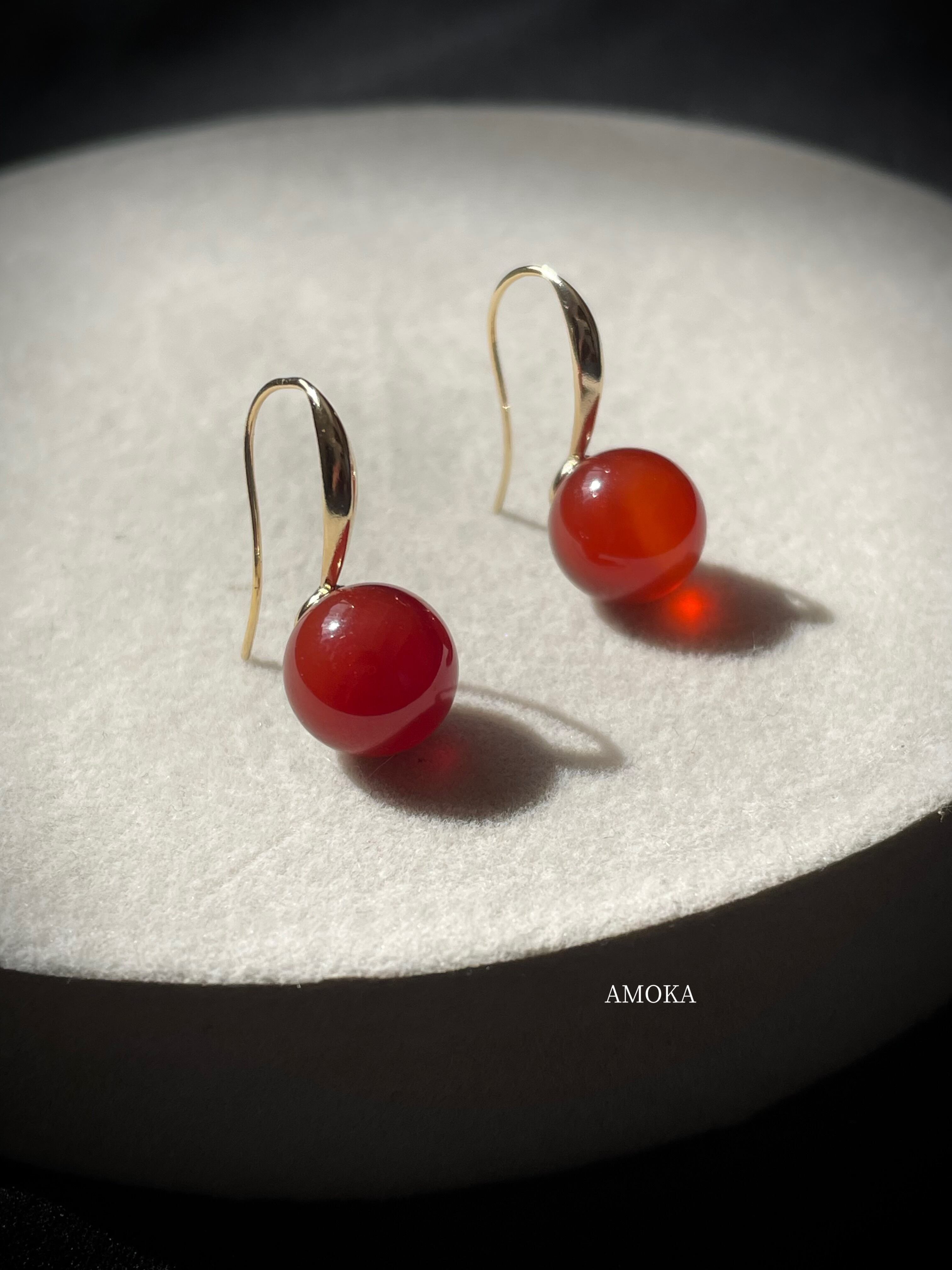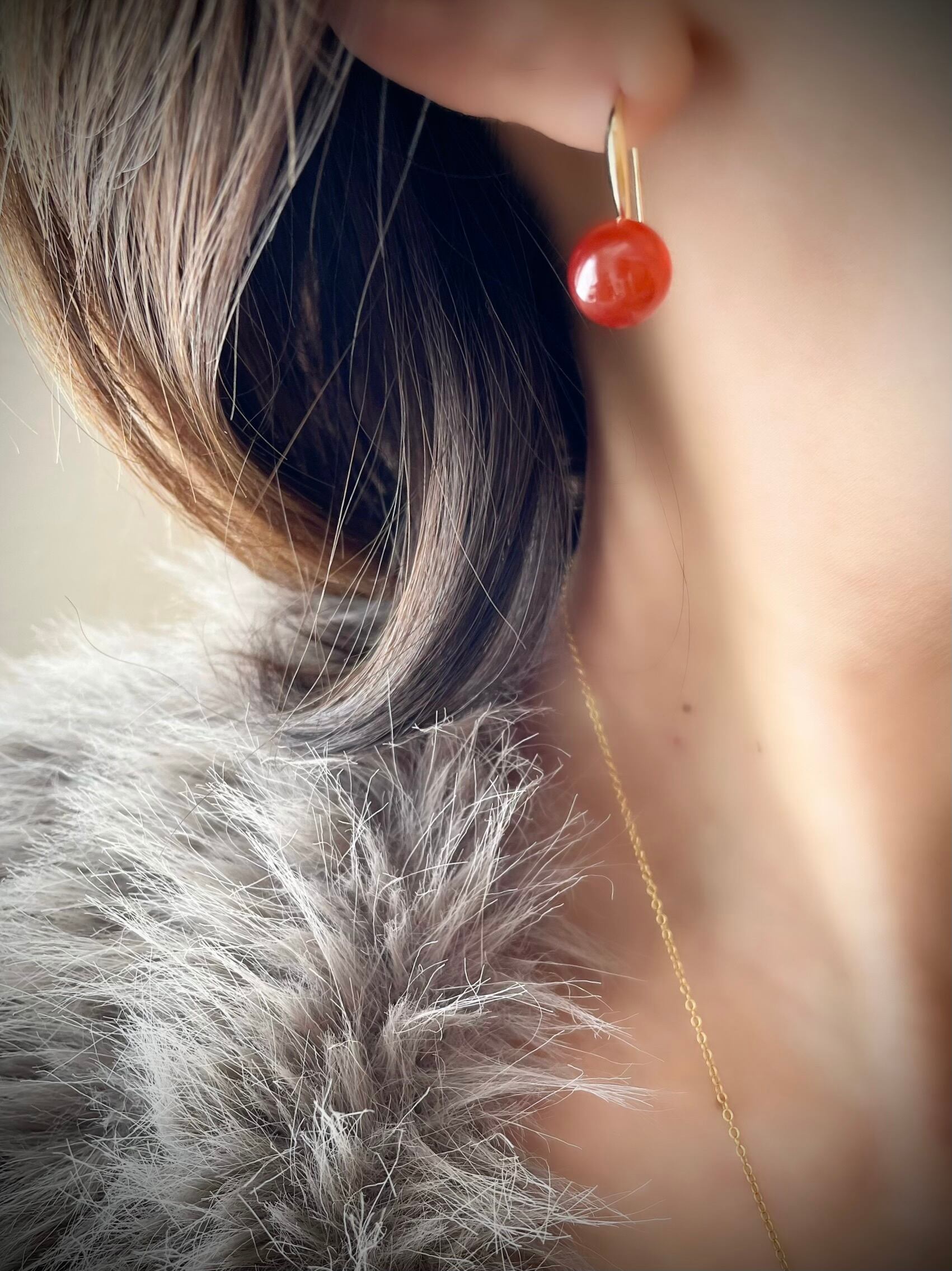 深い赤が印象的なレッドアゲートのデザインピアスです。ピアス金具部分は流れるようなカーブを描き、付けたときに、しっとりとした、上品な印象もありながら、どこか可憐な感じもあるのが特徴です。