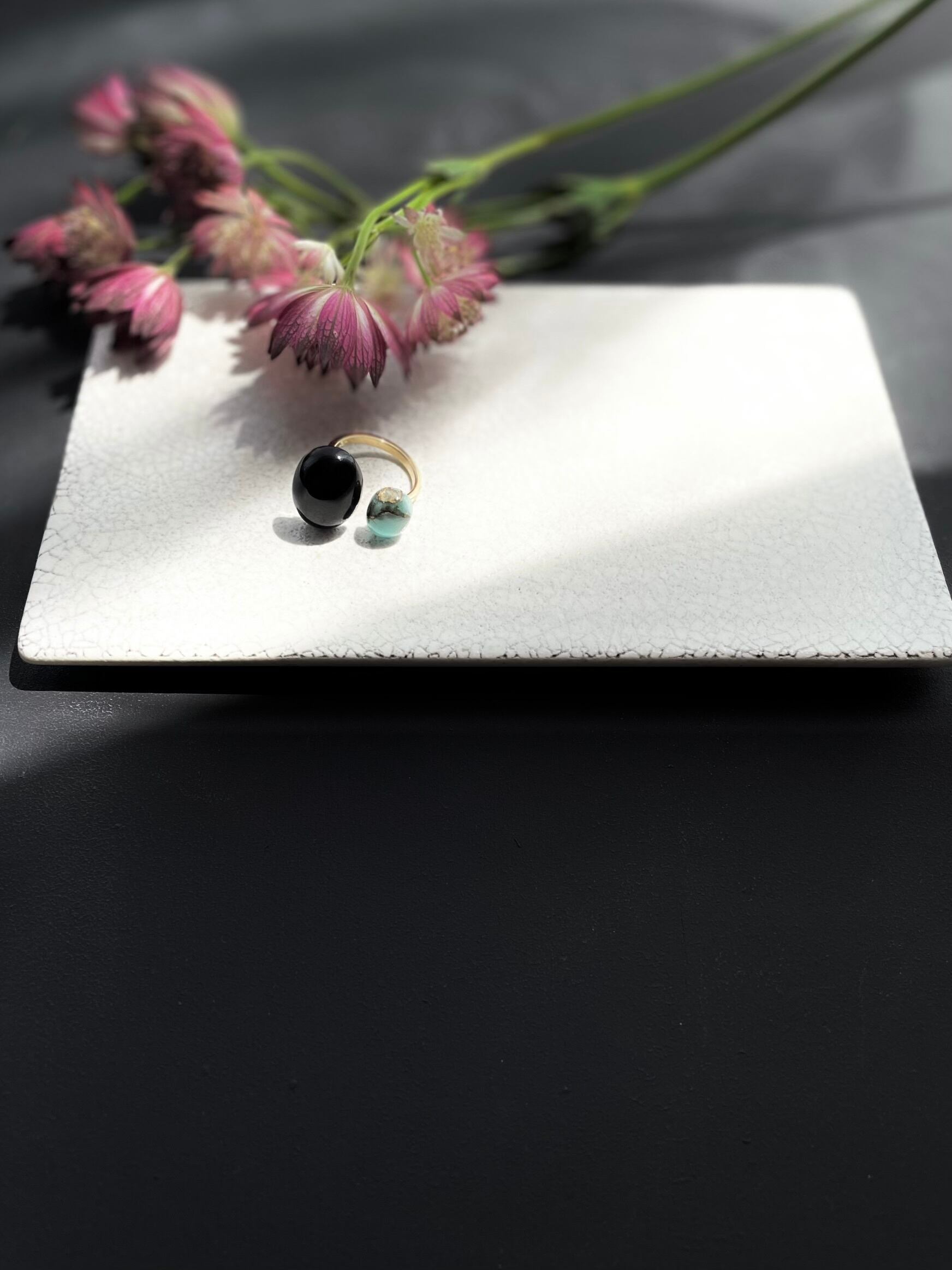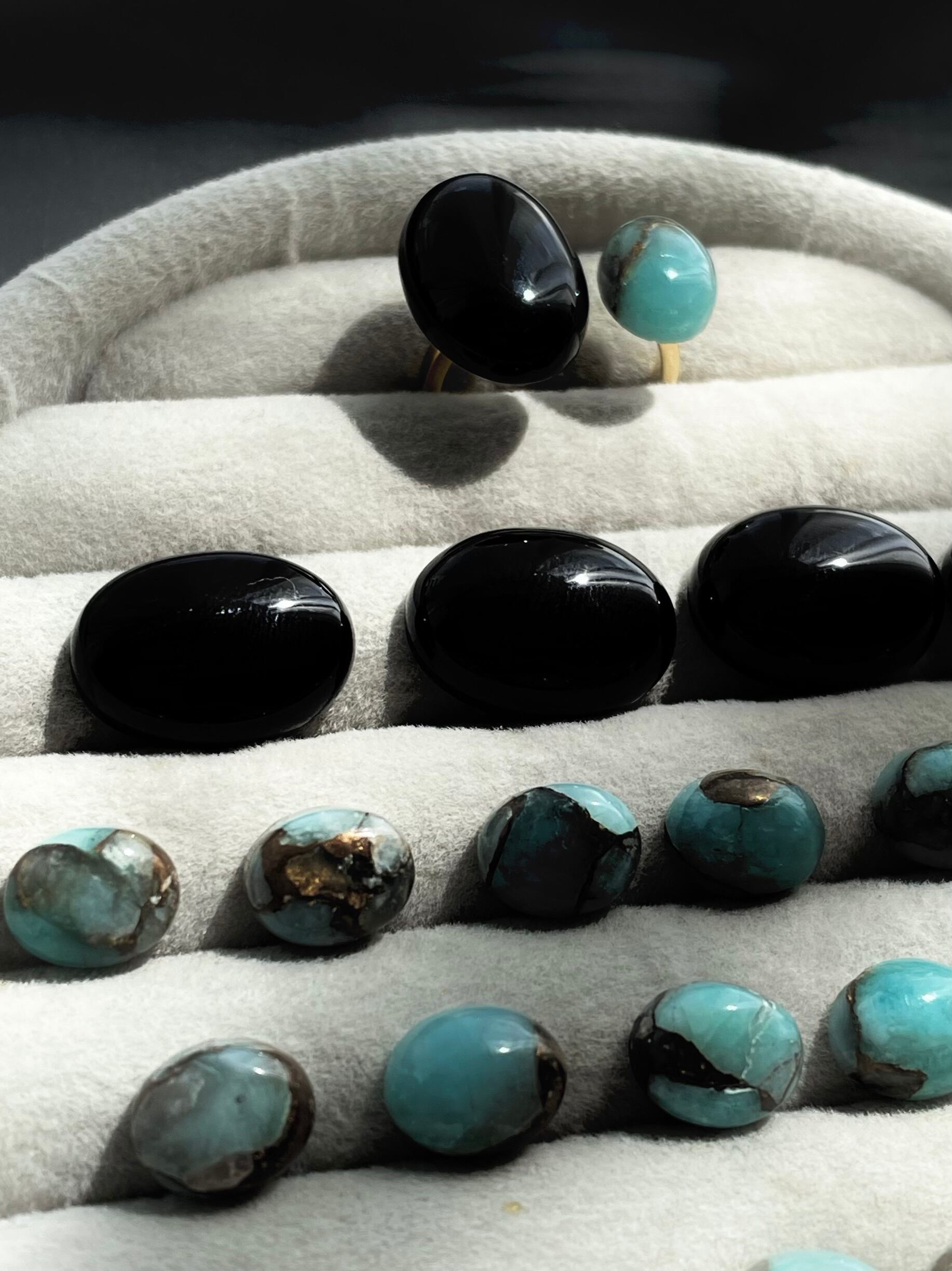 ブラックオニキスのブラックとコッパーアマゾナイトの美しいブルーが大人の女性の可愛いさや、落ちついた雰囲気を引き出してくれる一石二鳥なリングです。