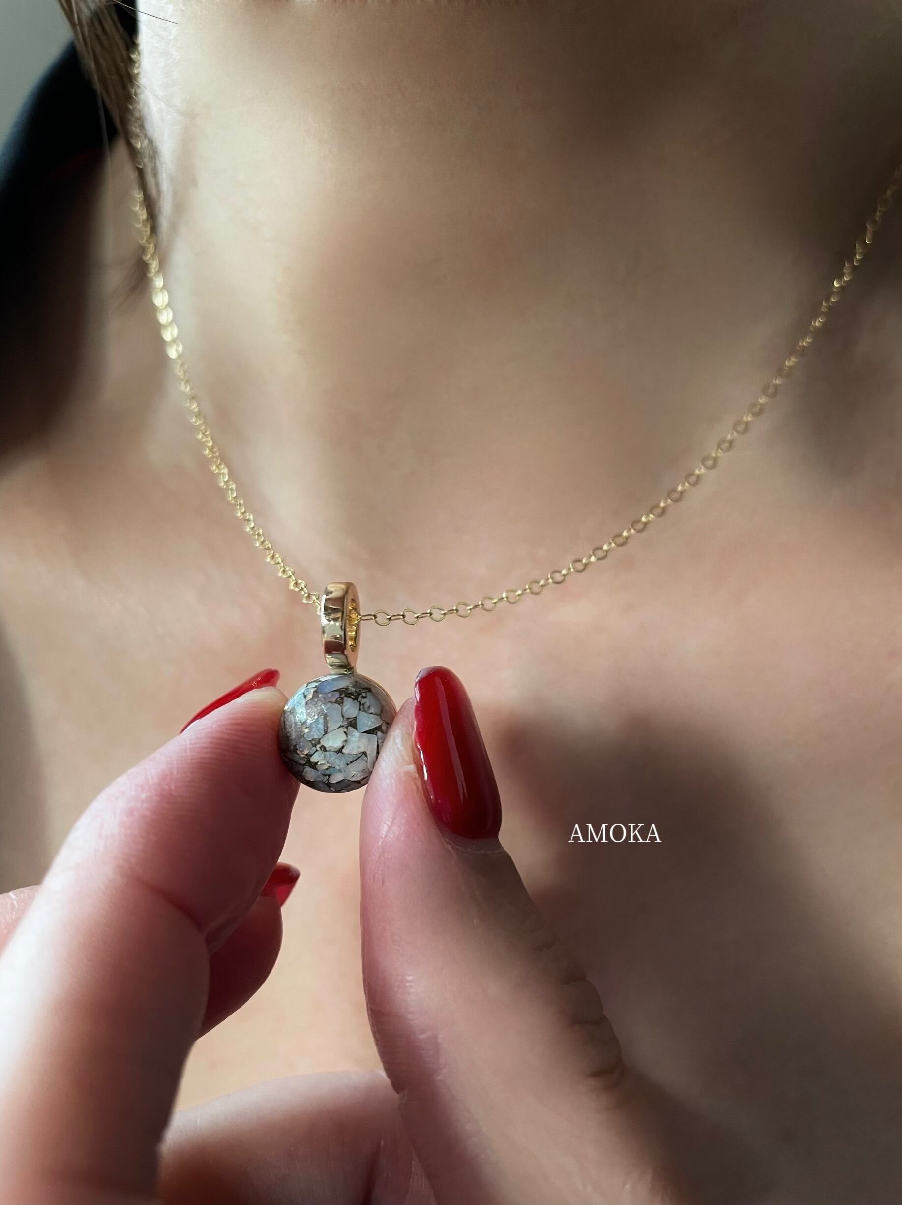 ◎チャームの台座は国内の老舗宝石店にオーダー製作をお願いしましたAMOKAオリジナル台座になります。14kメッキを施しておりますので、ゴールドの美しさは格別かと思います。又、裏面は波打つような模様をイメージしたデザインにもこだわっております。金属アレルギーのある方にも安心の素材にこだわりました。