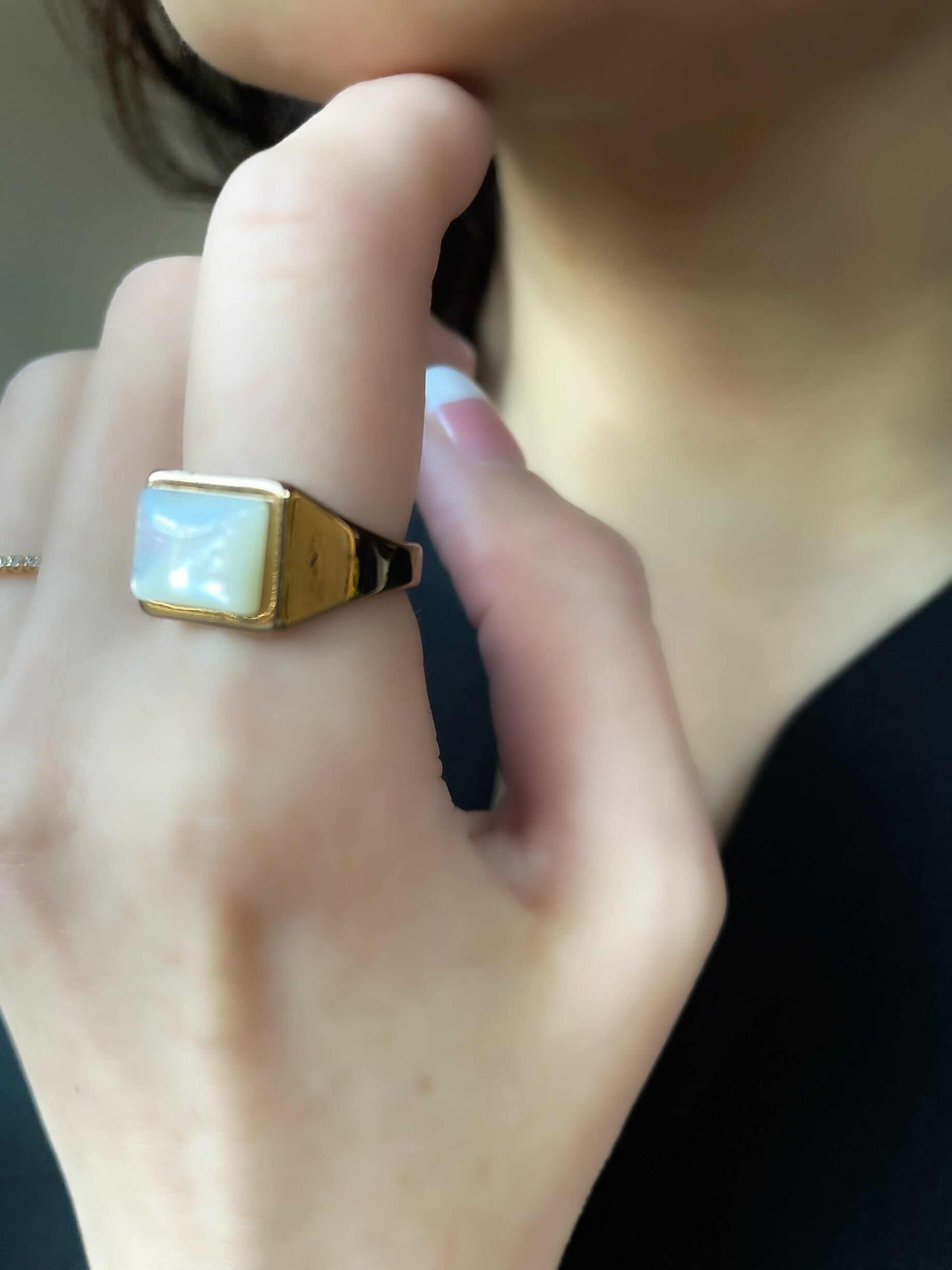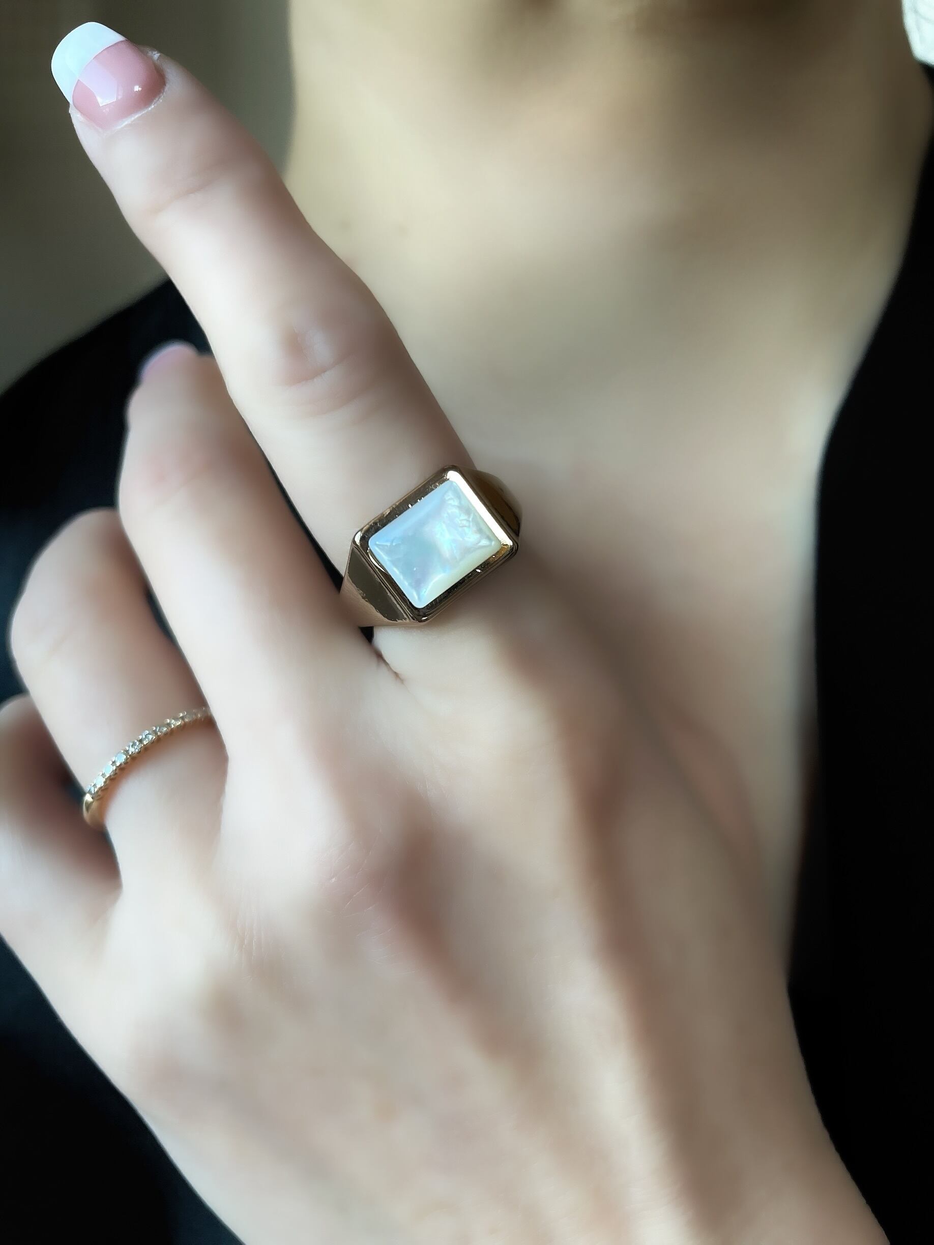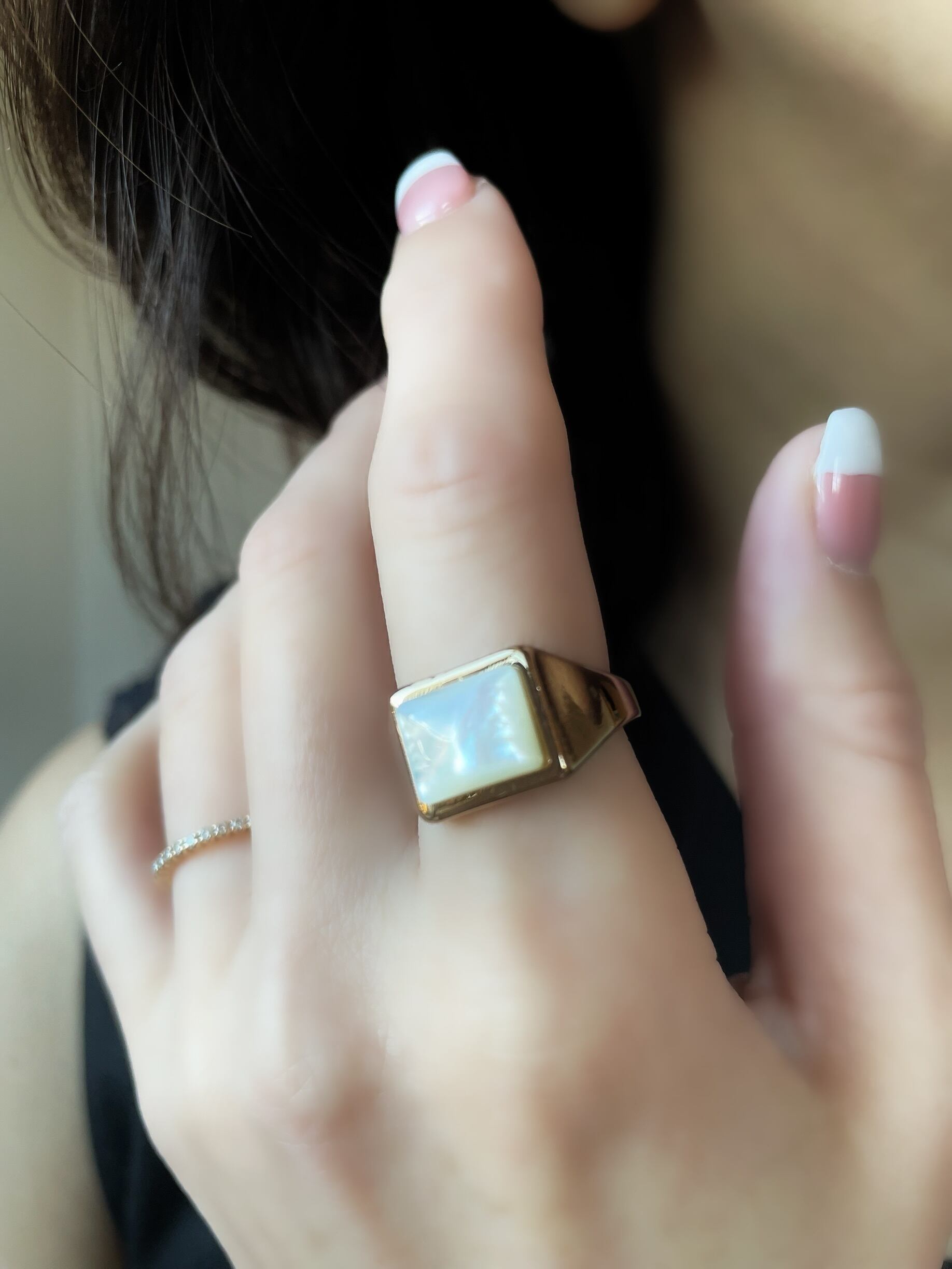 洗練されたレクタングルカットのホワイトシェルが、柔らかな光を纏いながら輝くリング。シェルならではの繊細な虹色の艶が、角度によって表情を変え、指元に上品なニュアンスを添えます。