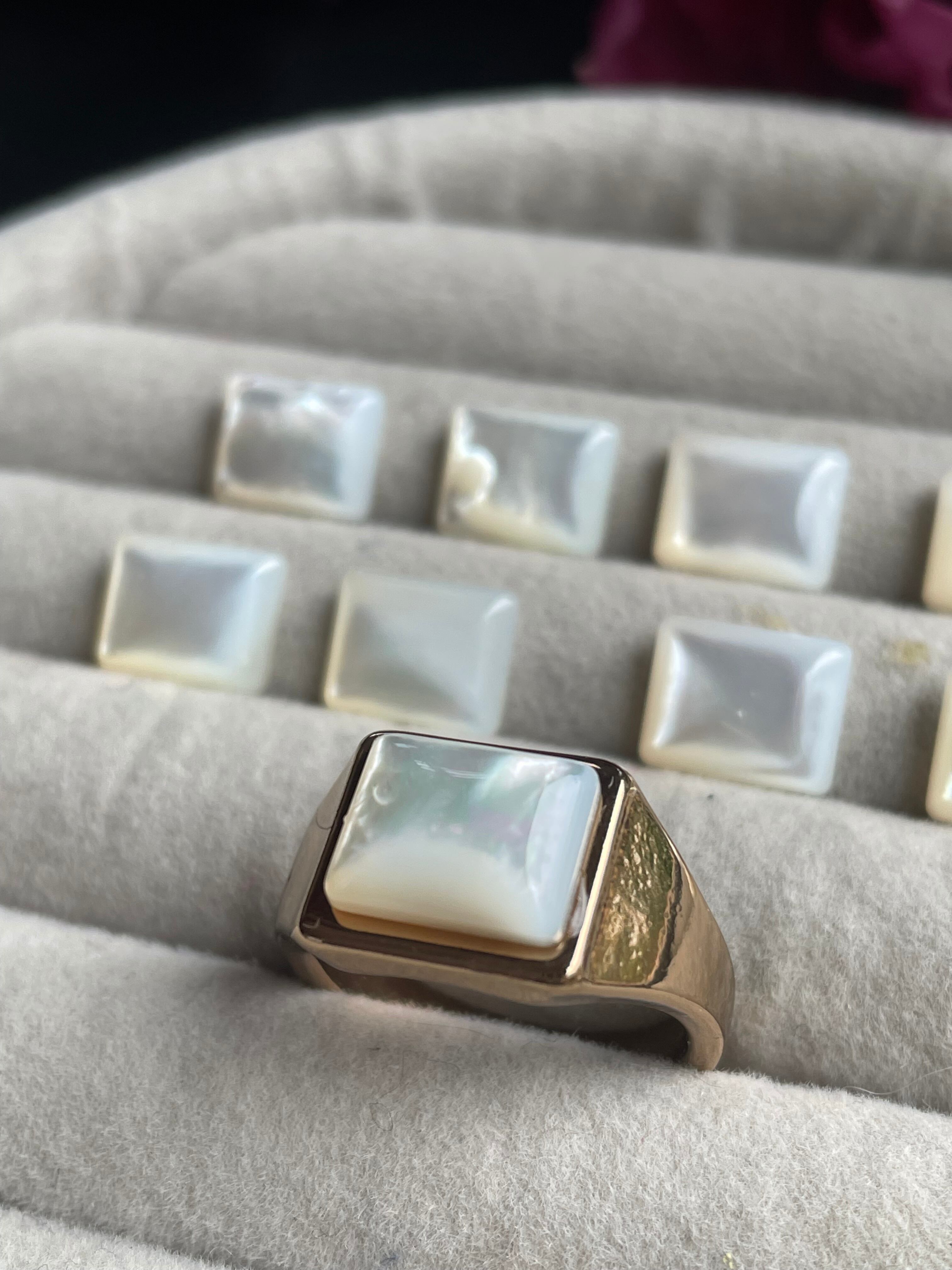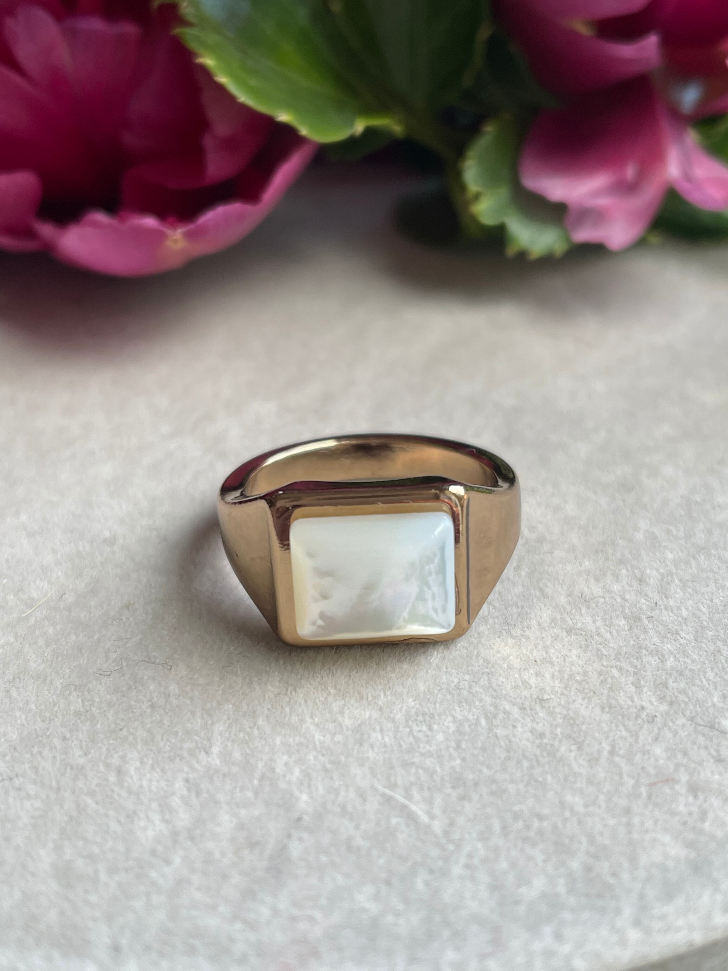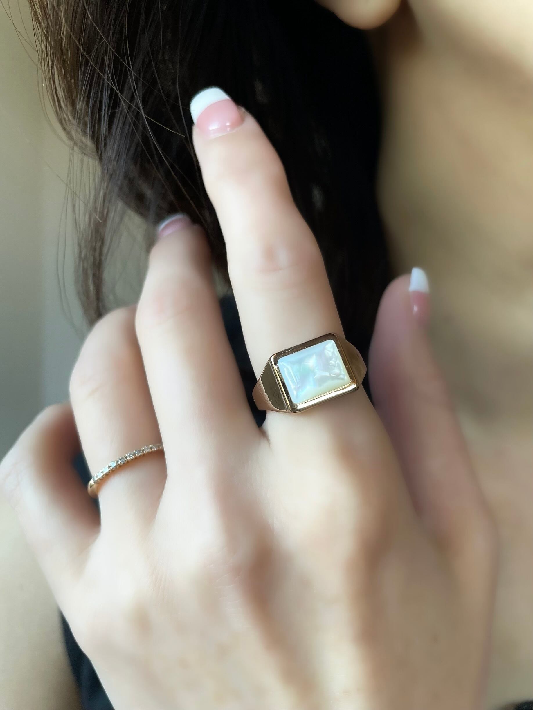 洗練されたレクタングルカットのホワイトシェルが、柔らかな光を纏いながら輝くリング。シェルならではの繊細な虹色の艶が、角度によって表情を変え、指元に上品なニュアンスを添えます。