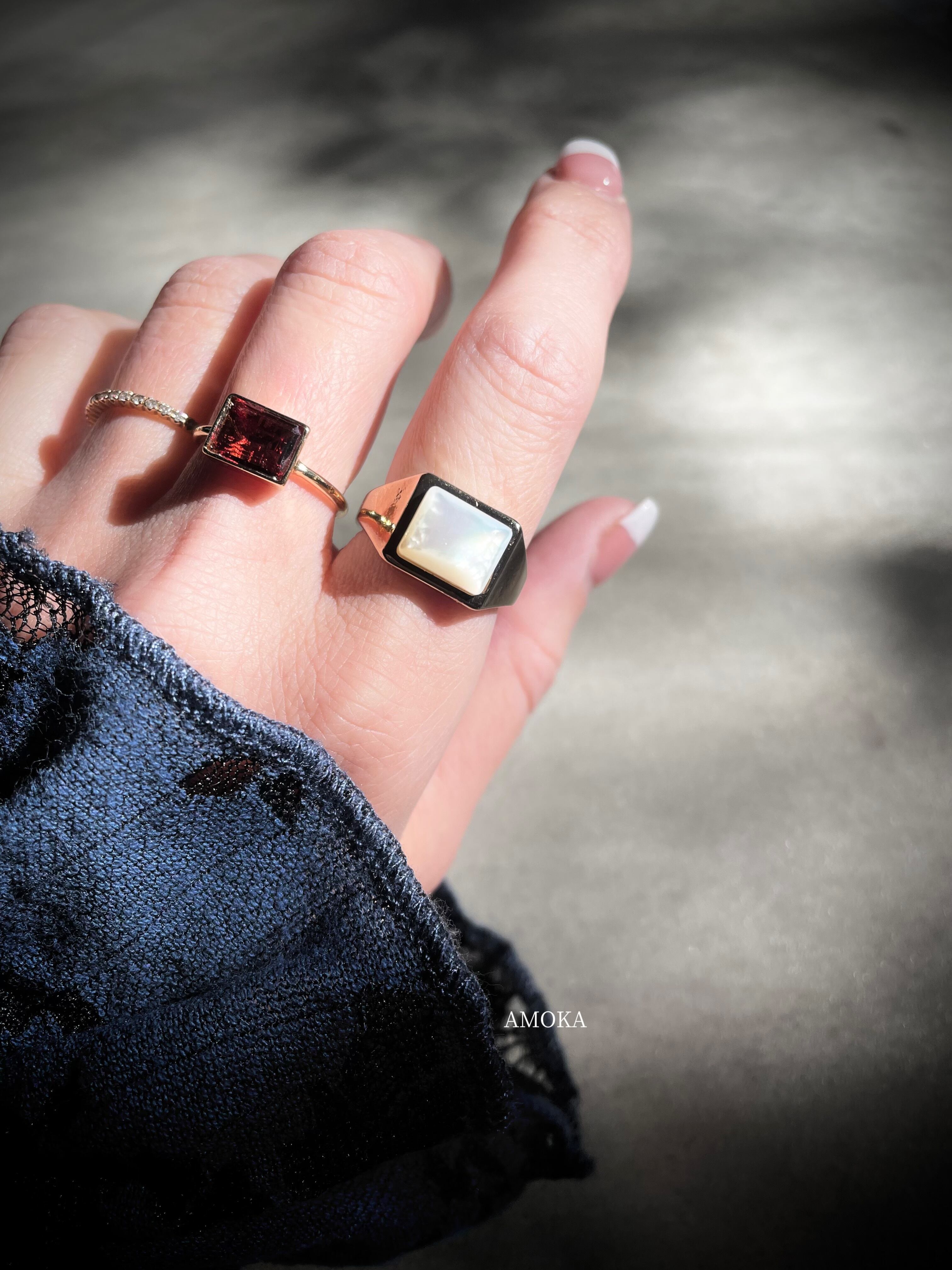 エレガンスと洗練を兼ね備えた、ルクタングルカットのガーネットとホワイトシェルのリングセット。深みのある情熱的なレッドのガーネットと、上品で柔らかな輝きを放つホワイトシェルが、指元を華やかに彩ります。